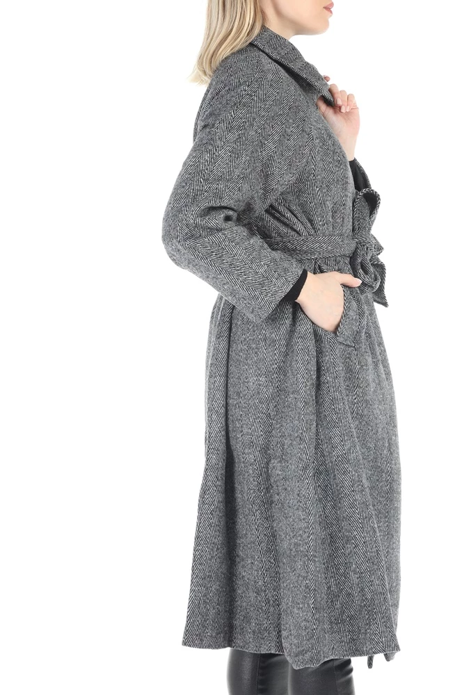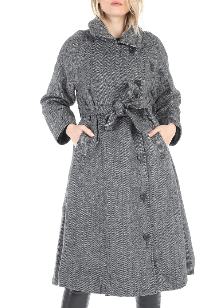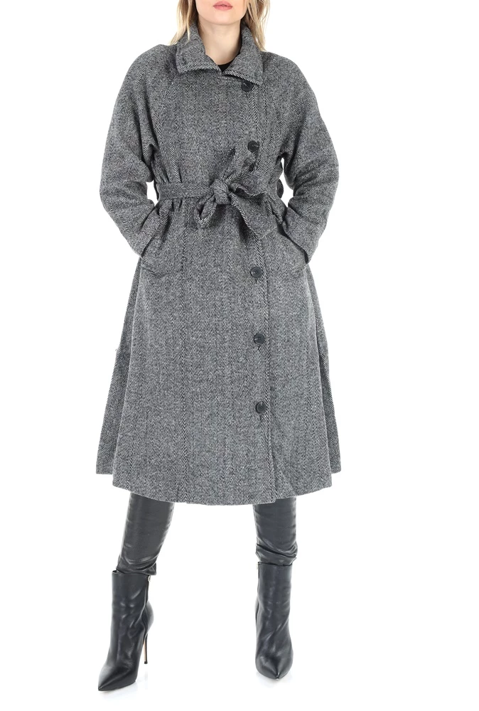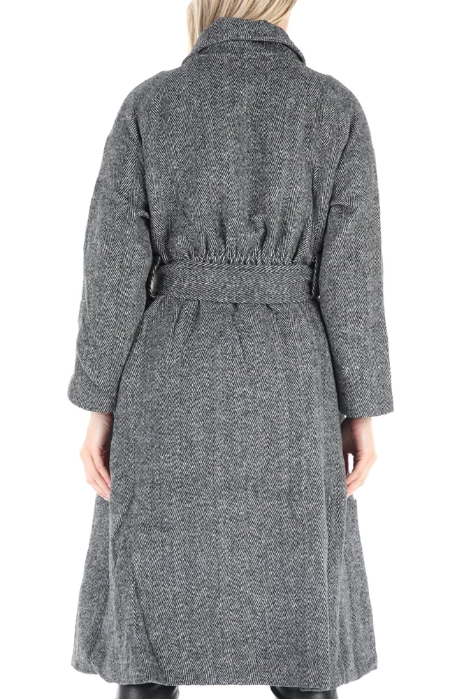 Γυναικείο παλτό σε γκρι απόχρωση με σχέδιο ψαροκόκκαλο. Έχει άλφα γραμμή, λοξά κουμπιά μπροστά και δέσιμο με ζώνη στη μέση.