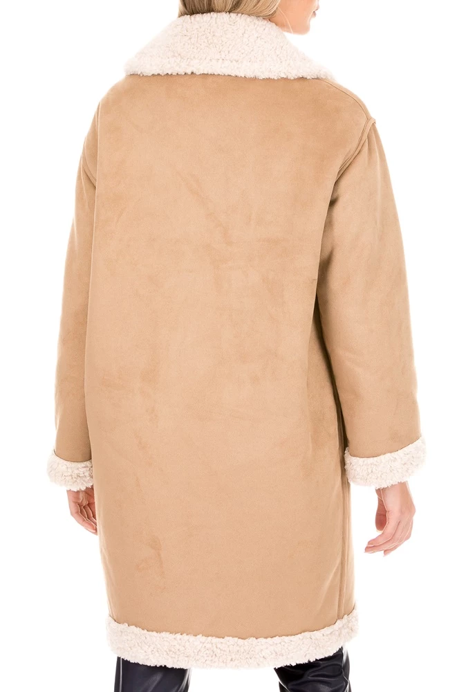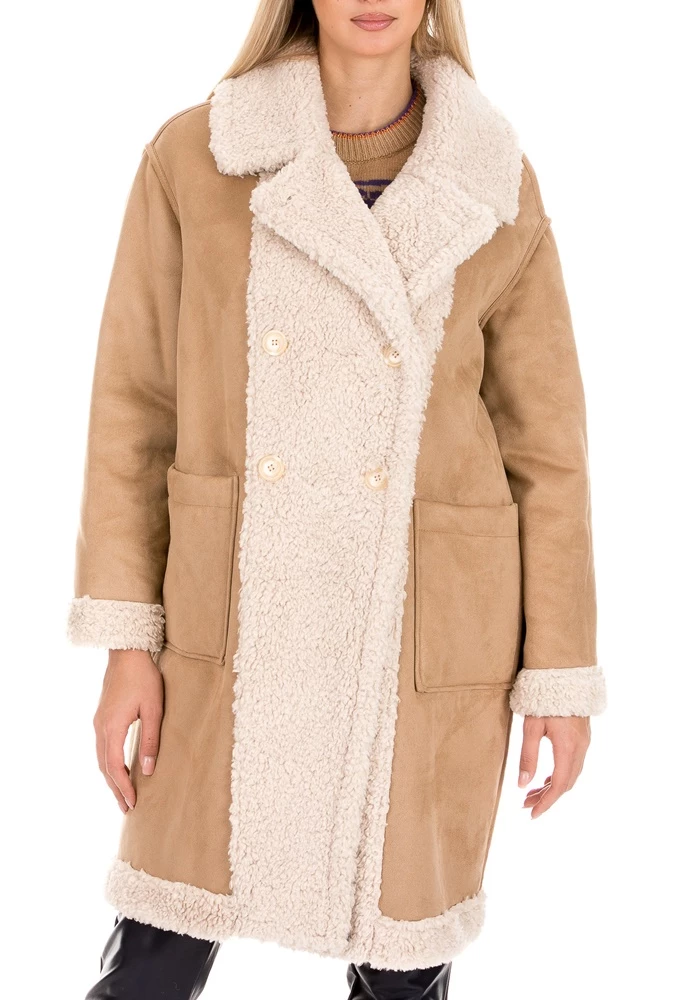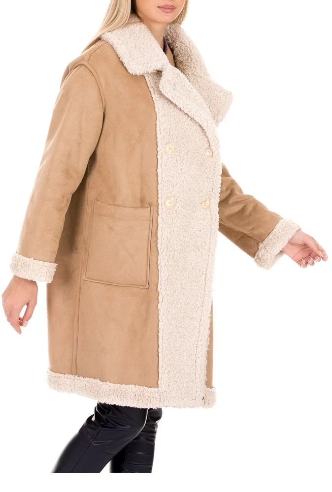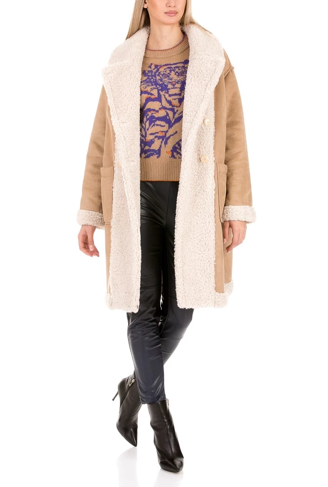 Γυναικείο παλτό MY TWINS σε μπεζ απόχρωση. Είναι σε ίσια γραμμή, με άνετη εφαρμογή από συνθετικό δέρμα με όψη σουέντ και γούνα sheepskin. Με μακριά μανίκια και μεγάλο γιακά με πέτο. Διαθέτει δύο τσέπες στα πλάγια και κλείνει με κουμπιά μπροστά.