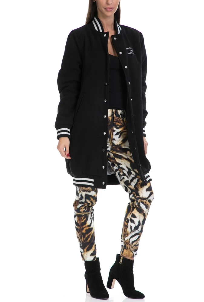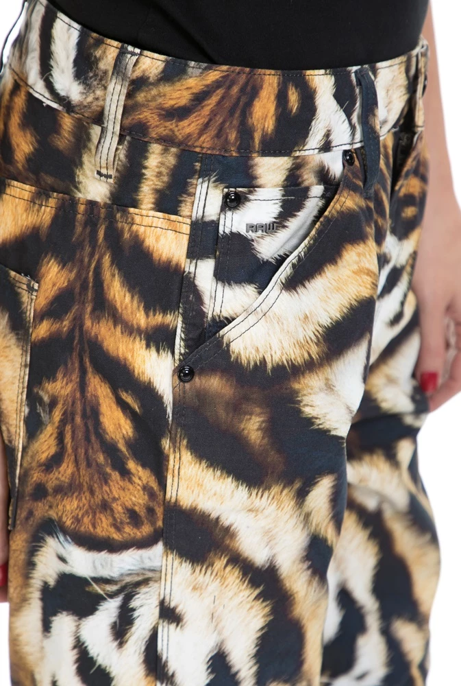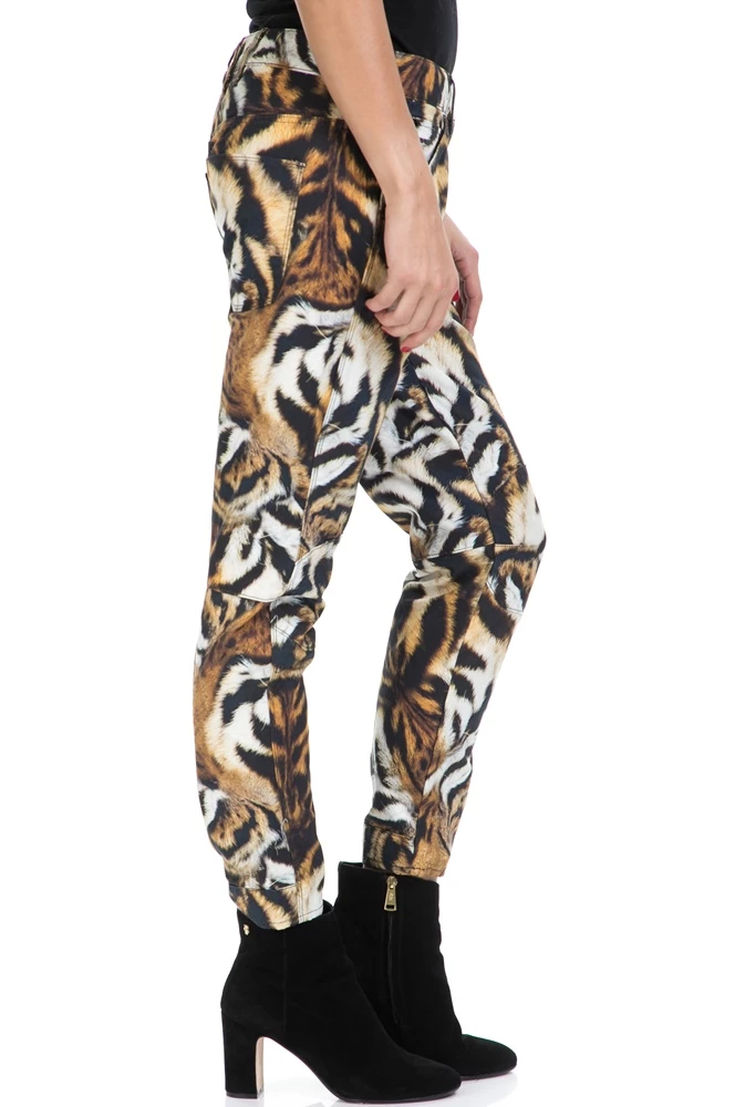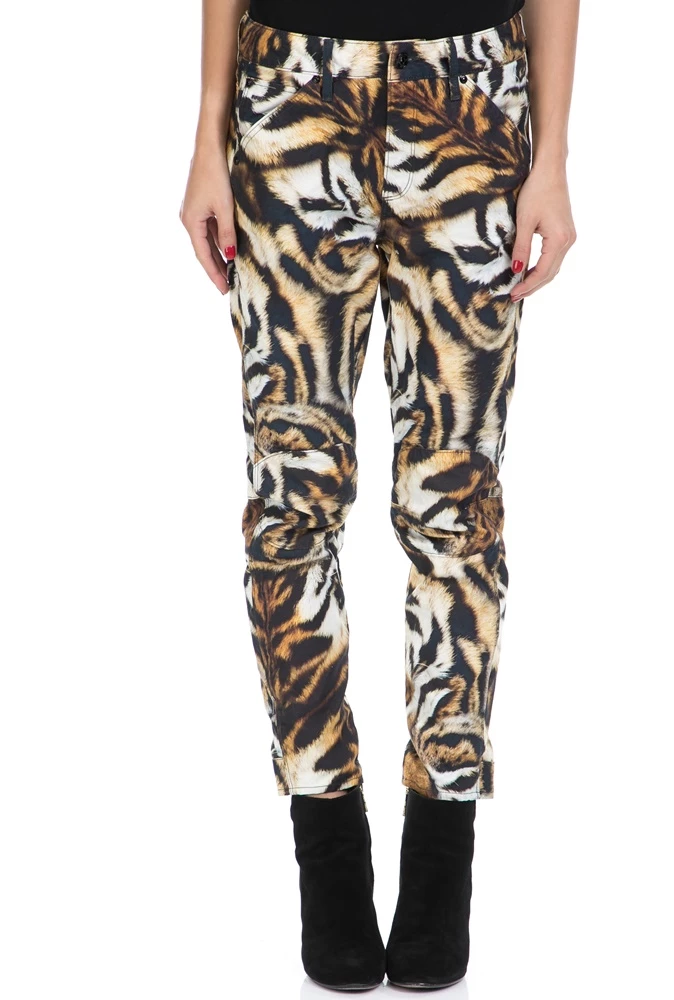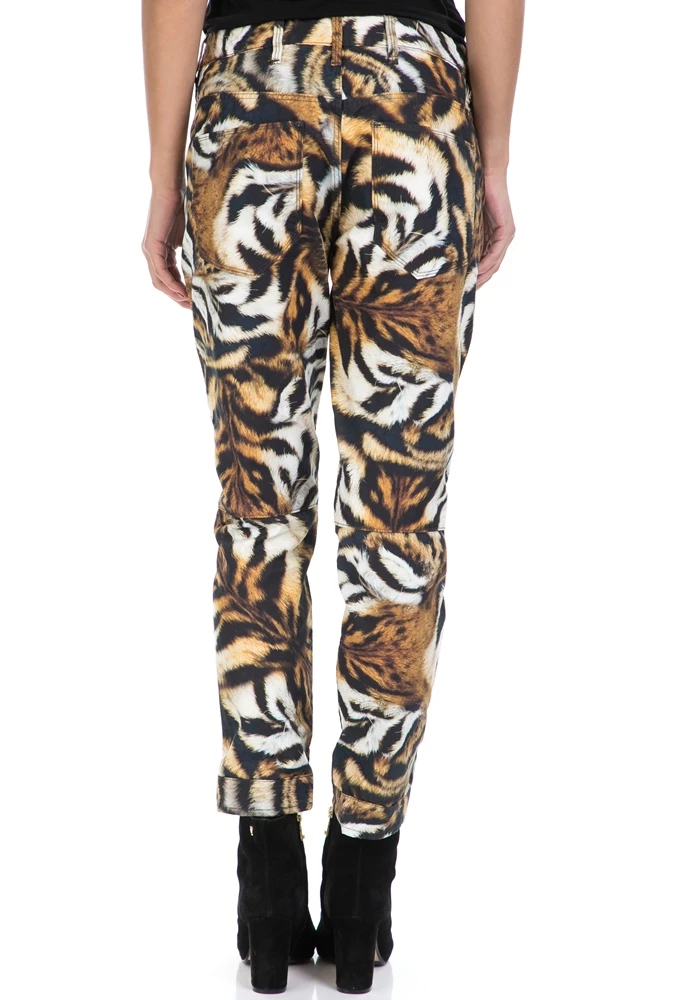 Γυναικείο βαμβακερό παντελόνι με τιγρέ μοτίβα σε μαύρη, καφέ και λευκή απόχρωση, ίσια γραμμή που στενεύει προς τα κάτω, μήκος στον αστράγαλο και τσέπες στο πλάι και πίσω.