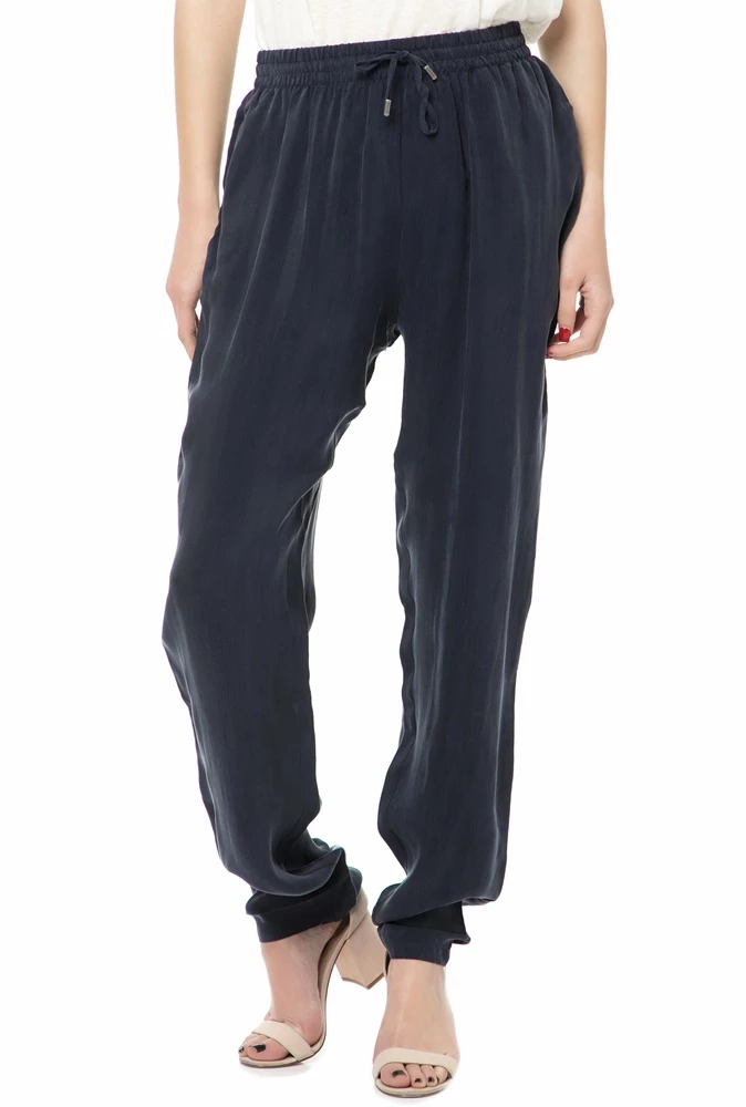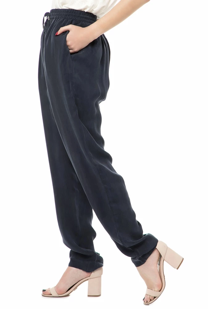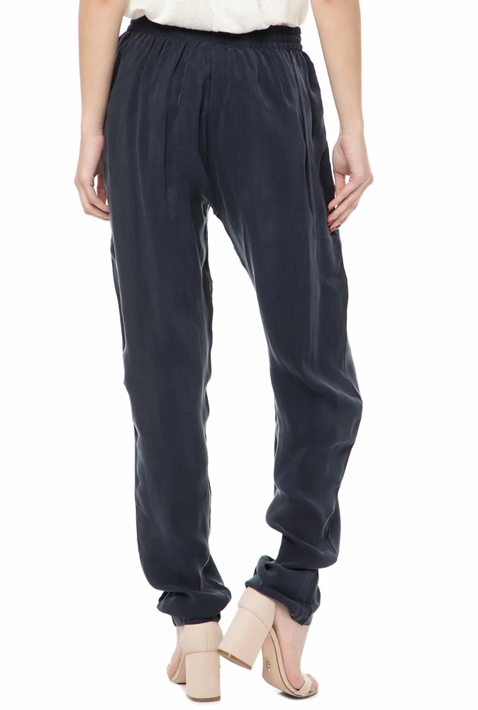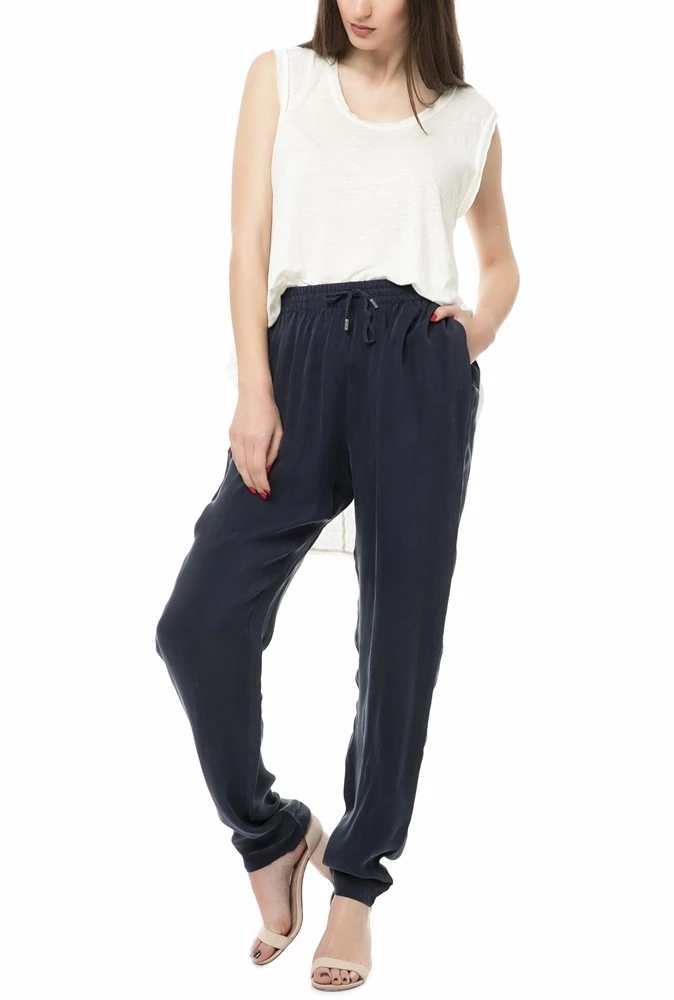Γυναικείο παντελόνι σε σκούρο μπλε χρώμα από μαλακό ύφασμα, ίσια γραμμή και λάστιχο με κορδόνι που σφίγγει στη μέση. Άνετο και μοντέρνο για casual look.