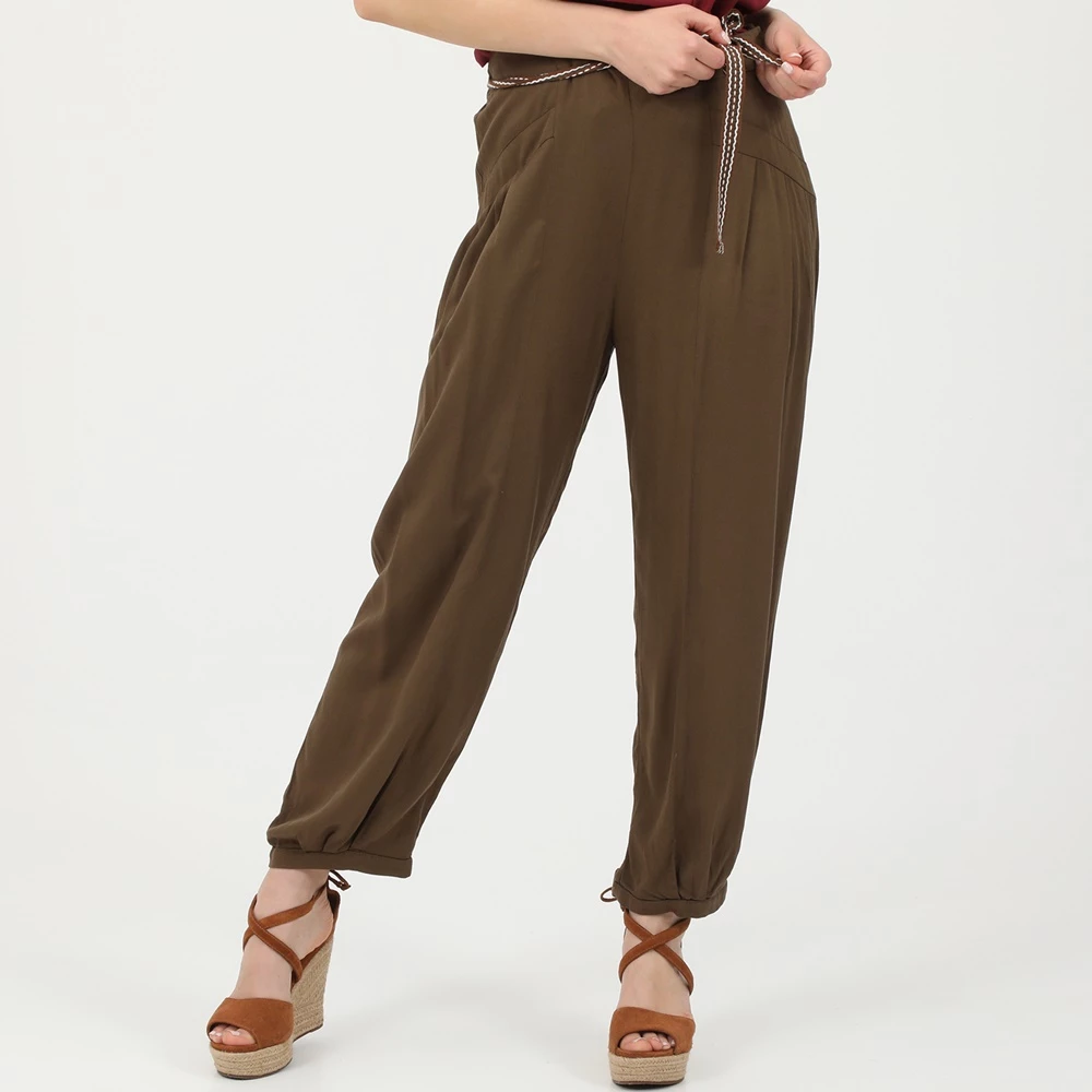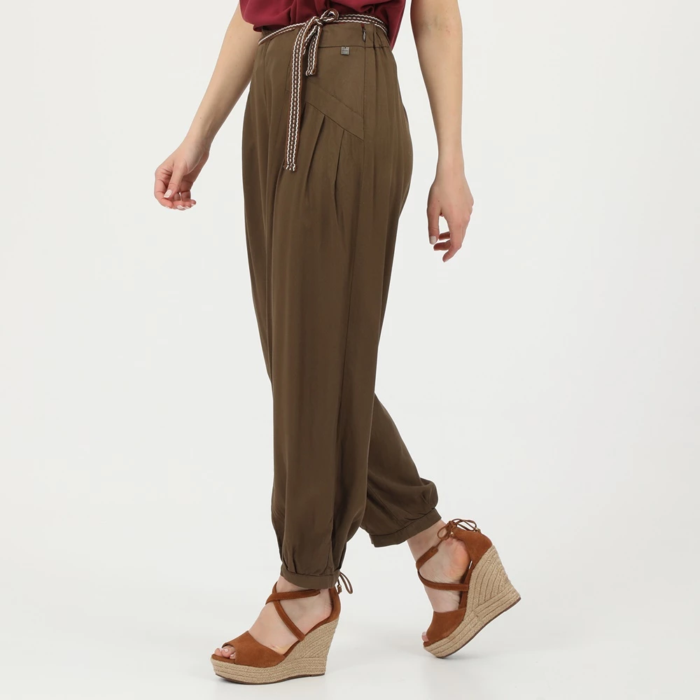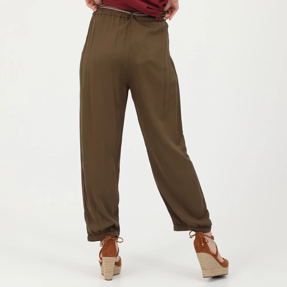 Γυναικείο παντελόνι ATTRATTIVO σε χακί απόχρωση. Είναι ψηλόμεσο, σε άνετη γραμμή, με αφαιρούμενη ζώνη στη μέση και λάστιχο στους αστραγάλους. Διαθέτει πιέτες μπροστά και κλείνει με φερμουάρ στο πλάι.