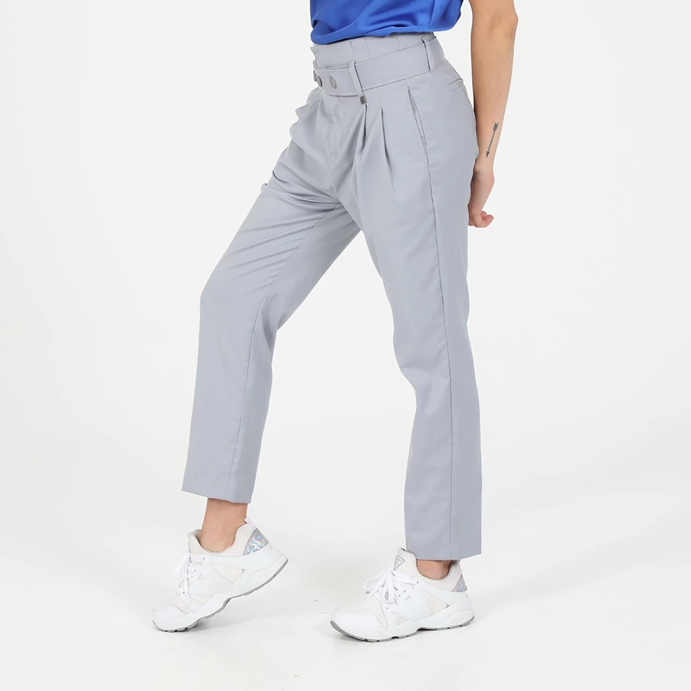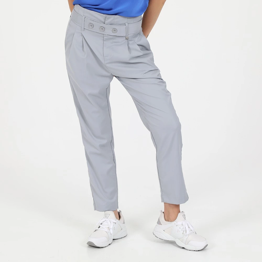 Γυναικείο παντελόνι ATTRATTIVO σε γκρι απόχρωση. Είναι ψηλόμεσο, με μήκος 7/8. Διαθέτει αφαιρούμενη ζ.ωνη με κουμπάκια στη μέση, πιέτες μπροστά και τσέπες στα πάγια και πίσω. Κλείνει με φερμουάρ.