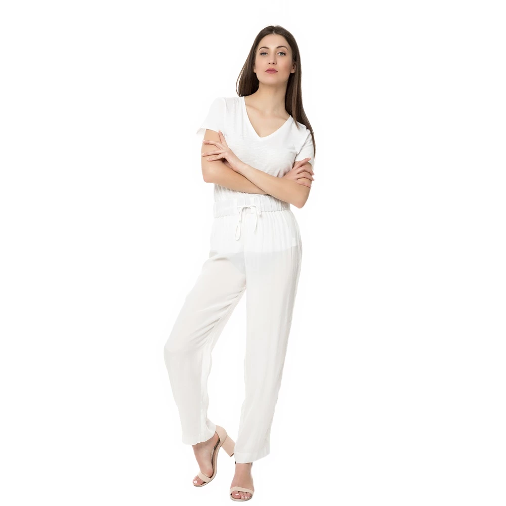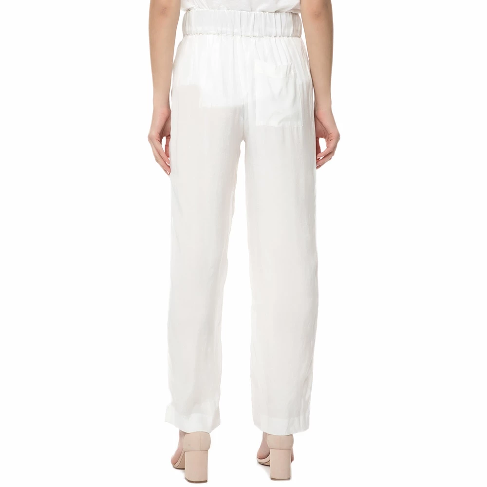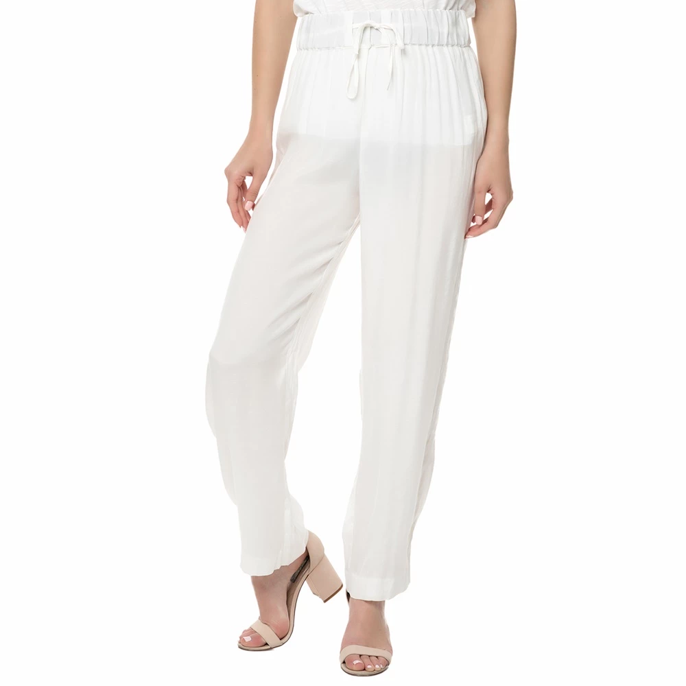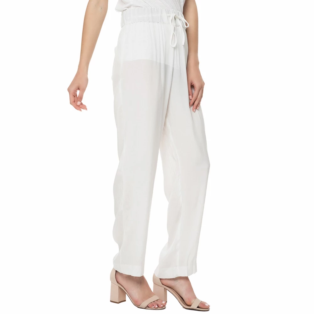 Γυναικείο παντελόνι σε λευκό χρώμα από μαλακό ημιδιαφανές ύφασμα, ίσια γραμμή και λάστιχο με κορδόνι που σφίγγει στη μέση. Άνετο και μοντέρνο για casual look.