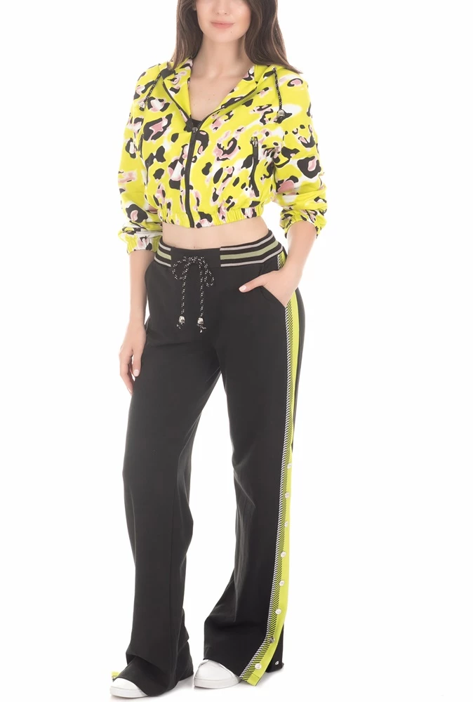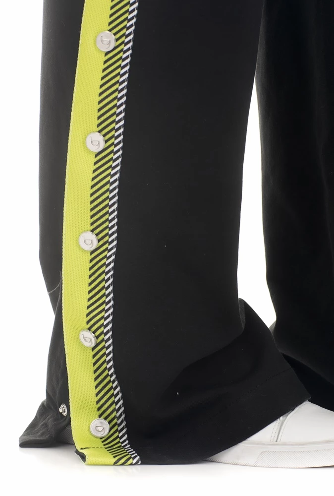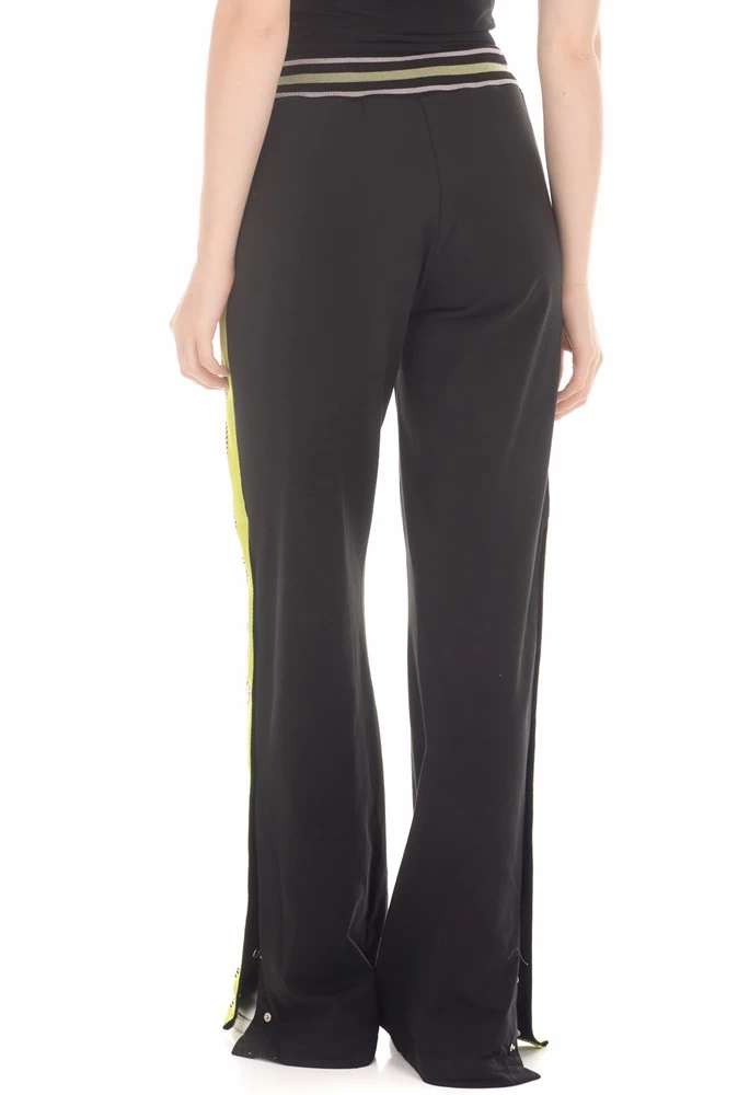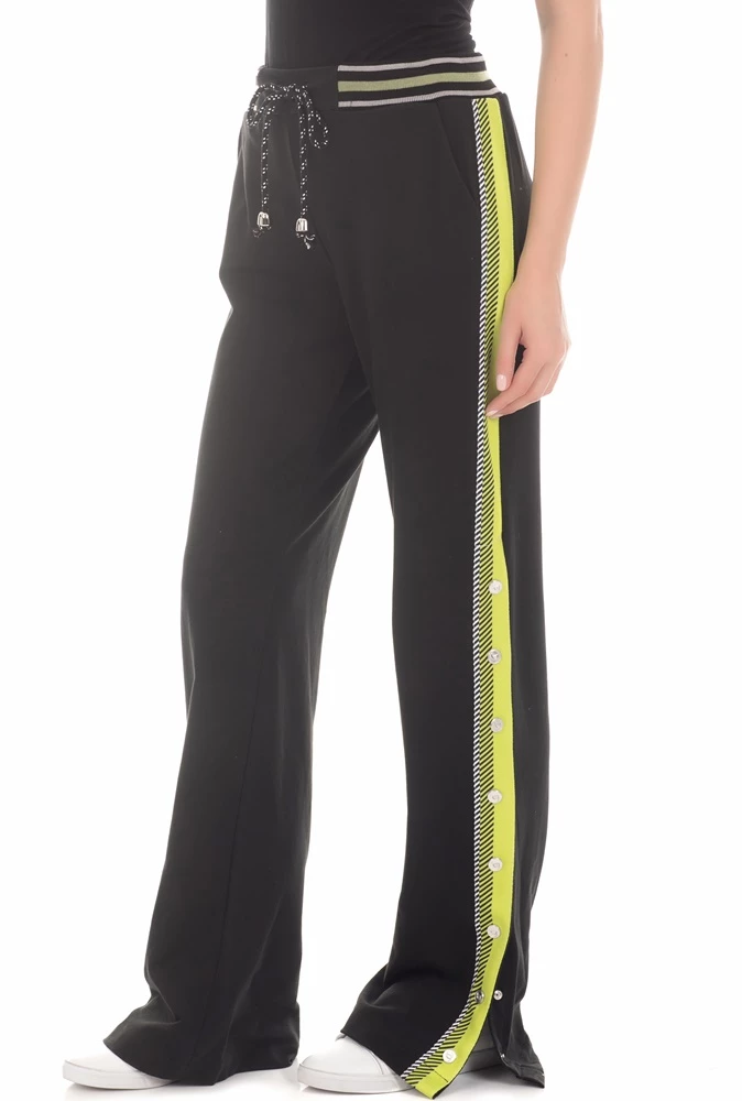 Γυναικείο παντελόνι φόρμας σε μαύρο χρώμα με κίτρινη ρίγα και κουμπιά κατά μήκος στα πλαϊνά. Έχει λάστιχο στη μέση για μεγαλύτερη άνεση και μοντέρνο στιλ που θα απογειώσει το sport look σου.