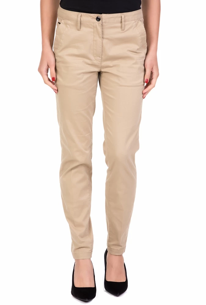 Γυναικείο παντελόνι chino σε μπεζ απόχρωση και skinny γραμμή. Έχει πλαϊνές τσέπες, κλασικό στιλ και κλείσιμο με φερμουάρ και κουμπί. Θα το συνδυάσεις εύκολα με κάθε σου ρούχο.