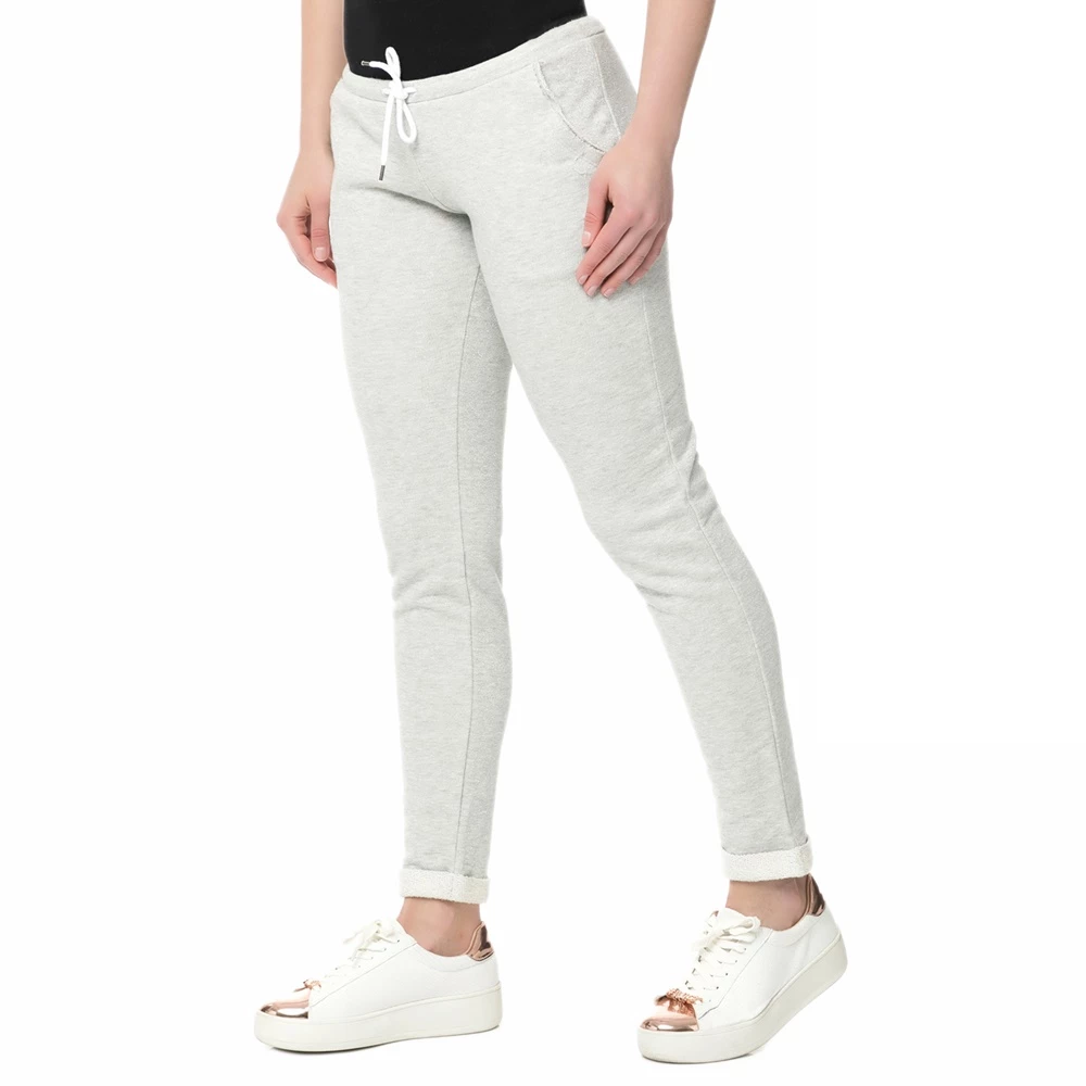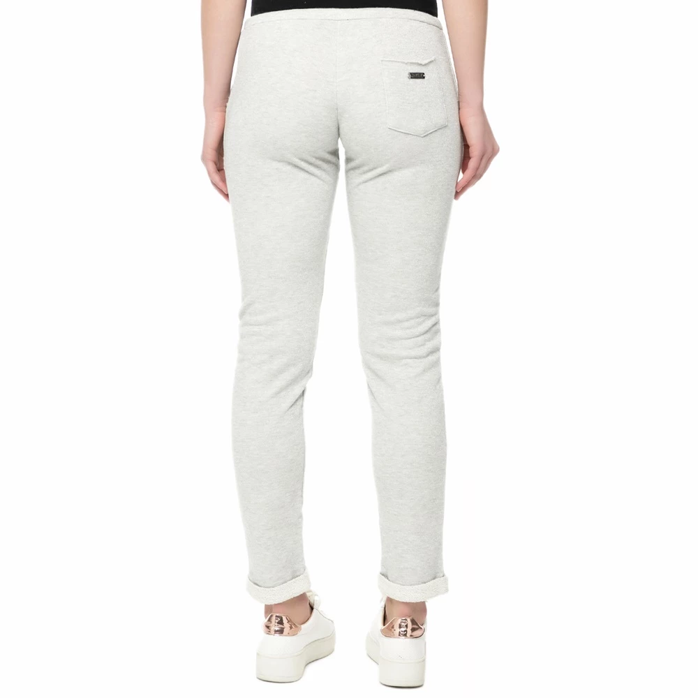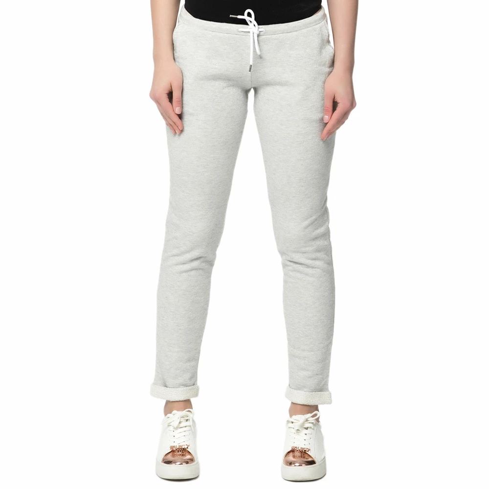 Γυναικείο παντελόνι φόρμας σε ανοιχτό γκρι χρώμα, στενή γραμμή και γυρισμένο ρεβέρ. Ιδανική επιλογή για casual εμφανίσεις.