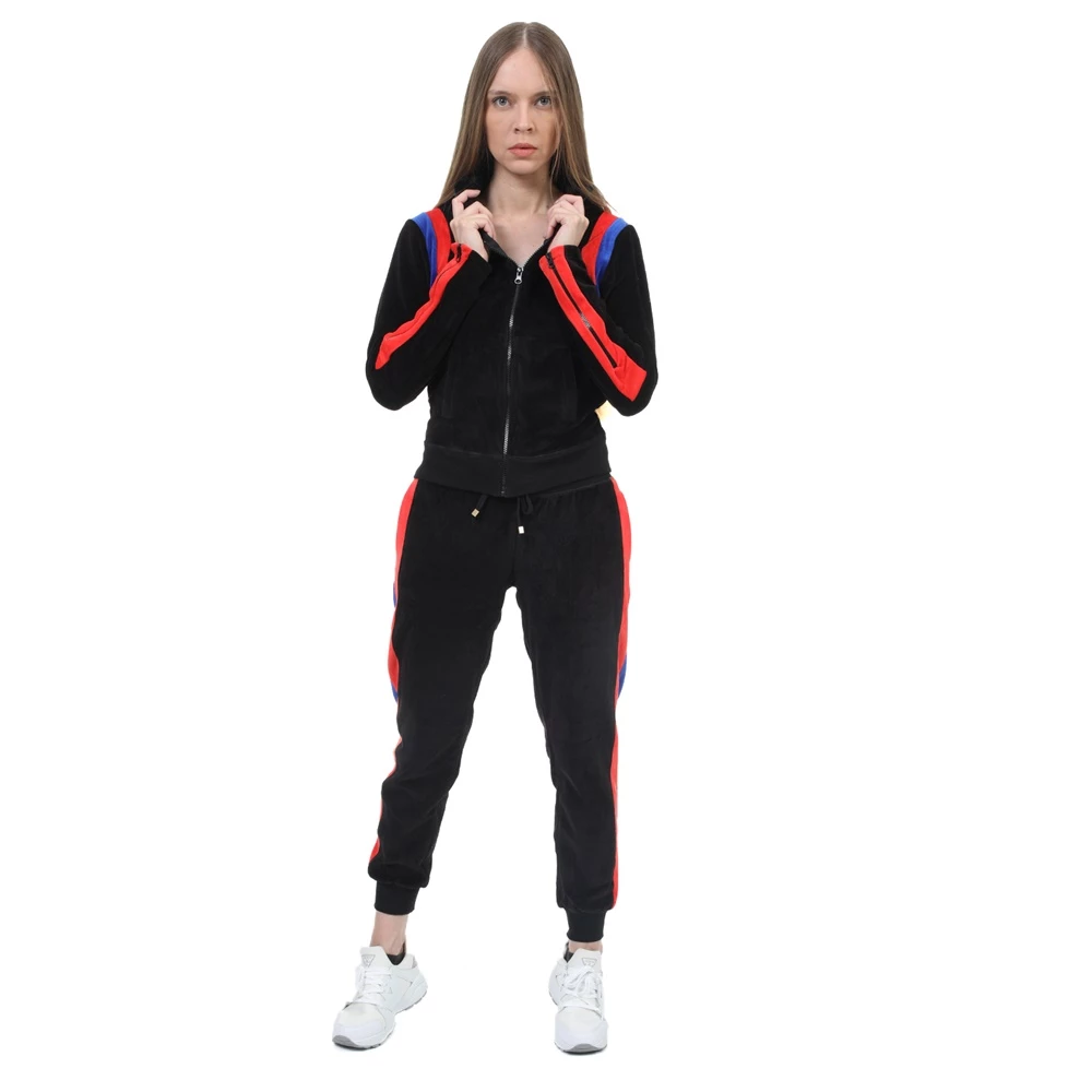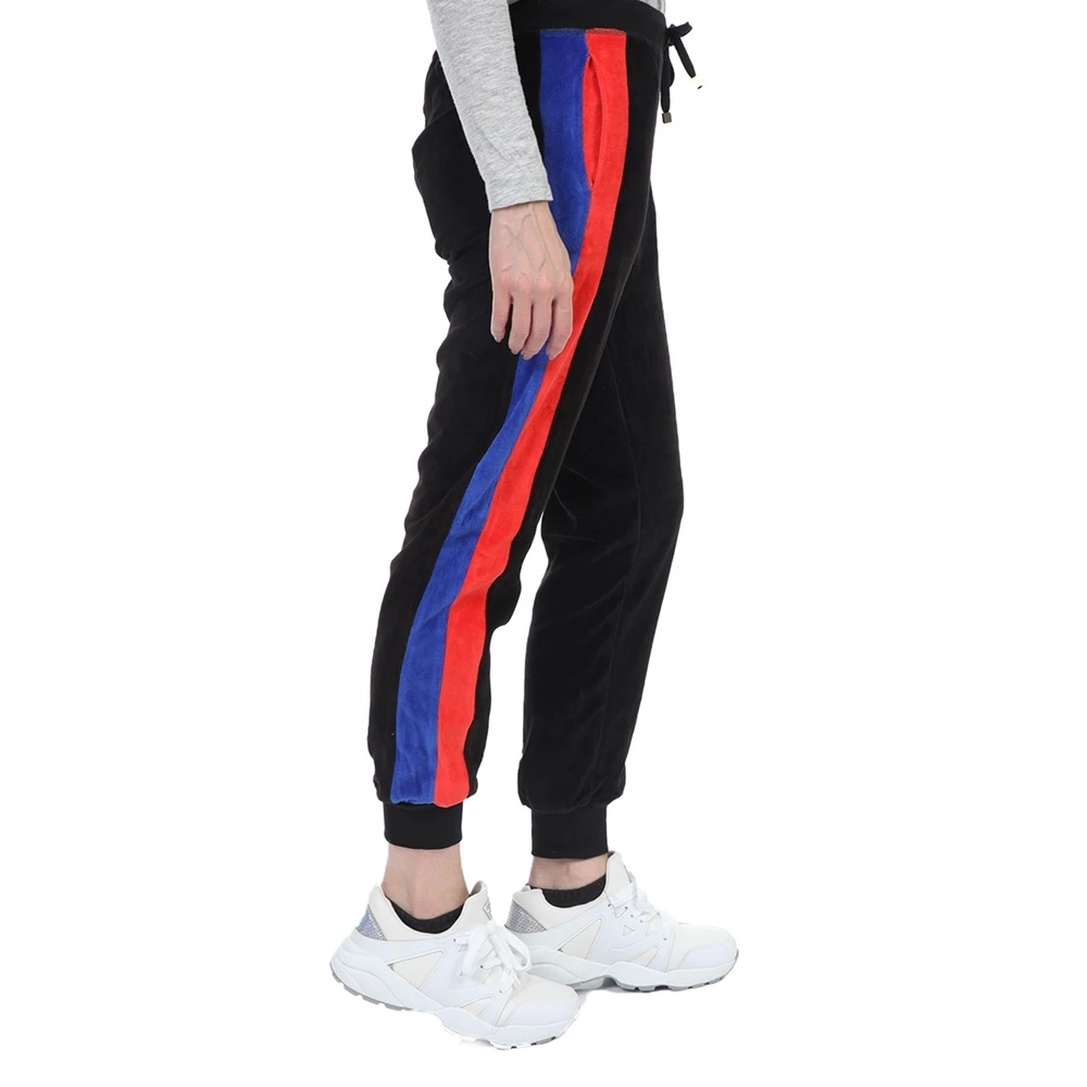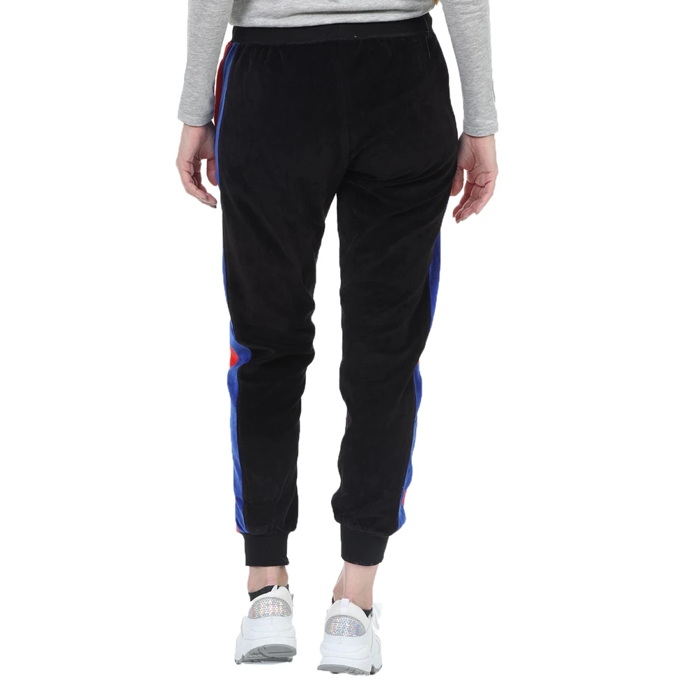 Γυναικείο παντελόνι φόρμας FOUR ANGELS BIKER σε μαύρο χρώμα, με κόκκινες και μπλε ρίγες στις δύο πλευρές. Από βελουτέ ύφασμα, σε στιλ jogger με μπατζάκια που στενεύουν προς τα κάτω. Διαθέτει λάστιχο με κορδόνι στη μέση και δύο τσέπες στα πλάγια.