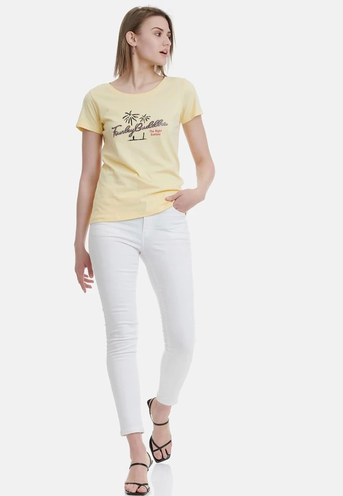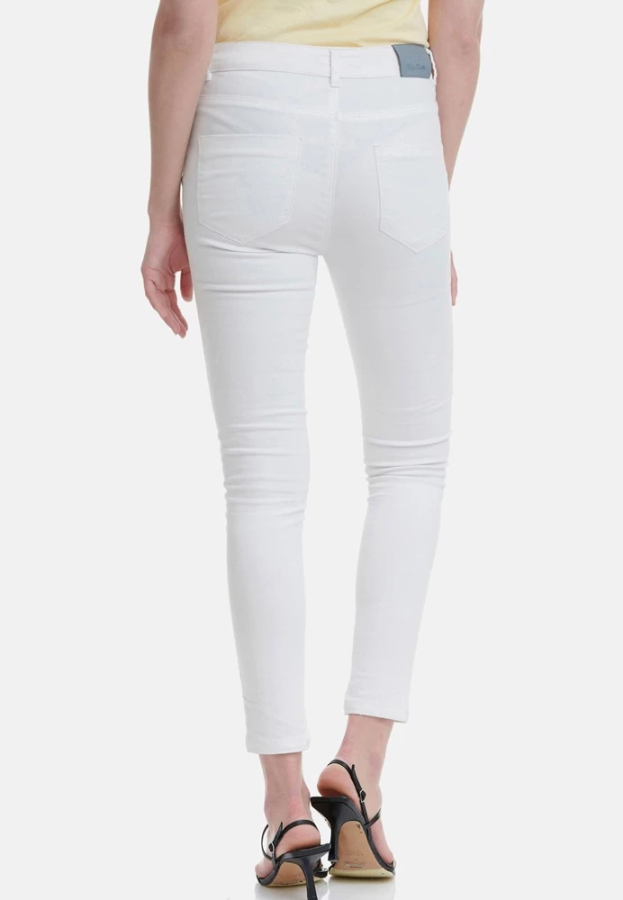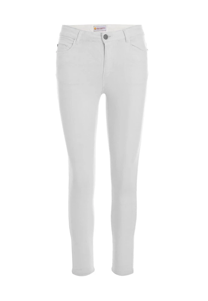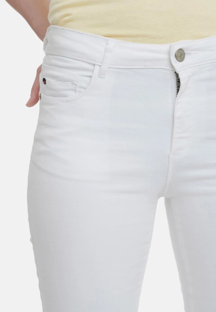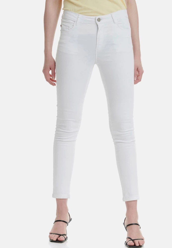 Γυναικείο παντελόνι FUNKY BUDDHA σε λευκό χρώμα. Από ελαστική βαμβακερή σύνθεση, με skinny εφαρμογή και κανονική μέση. Είναι σε στιλ πεντάτσεπου και κλείνει με κουμπί και φερμουάρ μπροστά.