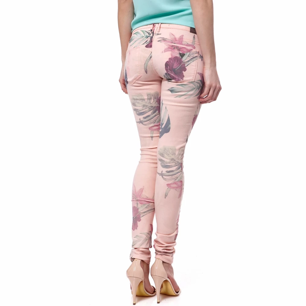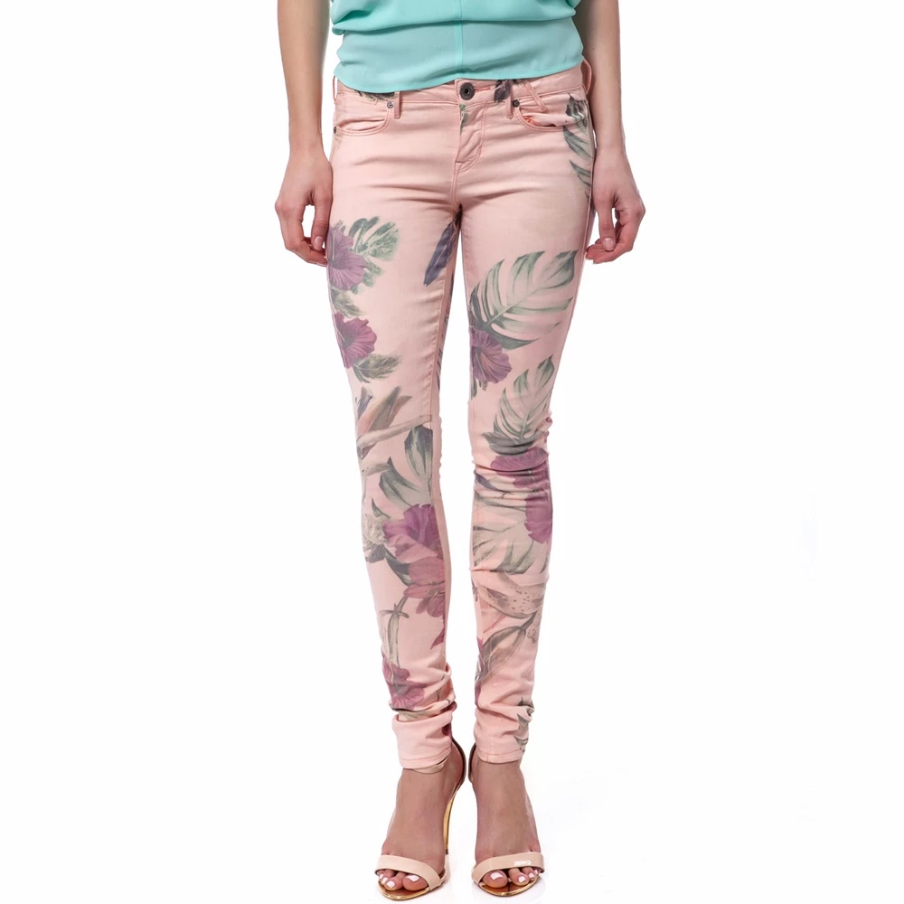 Βαμβακερό παντελόνι σε σομών-ροζ απόχρωση και floral σχέδια κατά μήκος του στις αποχρώσεις του πράσινου και του φούξια. Εχει στενή γραμμή που αναδεικνύει κάθε σιλουέτα. Το γαλάζιο τοπ και τα ψηλοτάνουνα nude πέδιλα θα ολοκληρώσουν μία άκρως ανοιξιάτικη εμφάνιση.