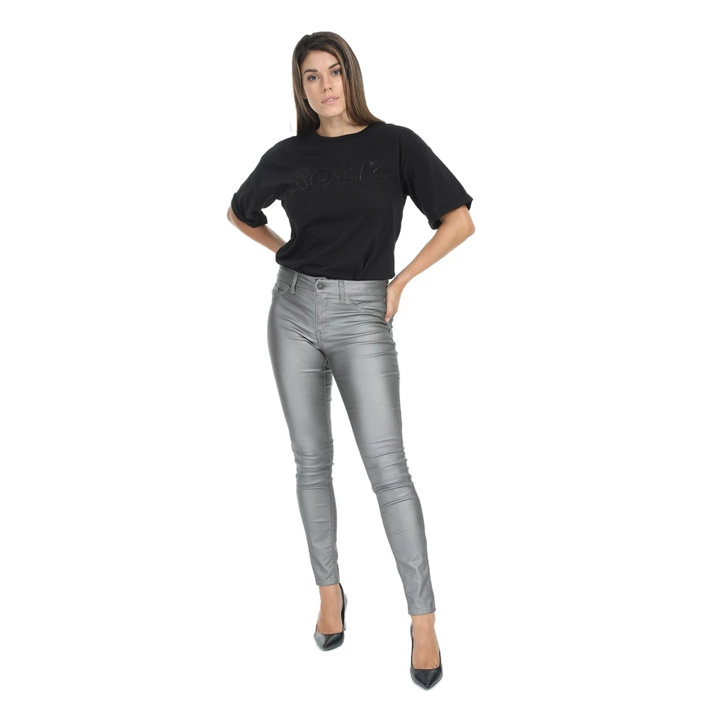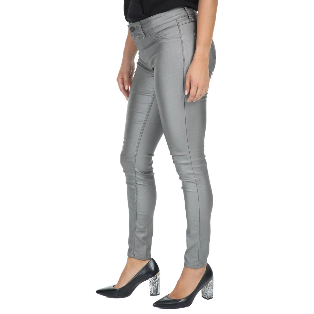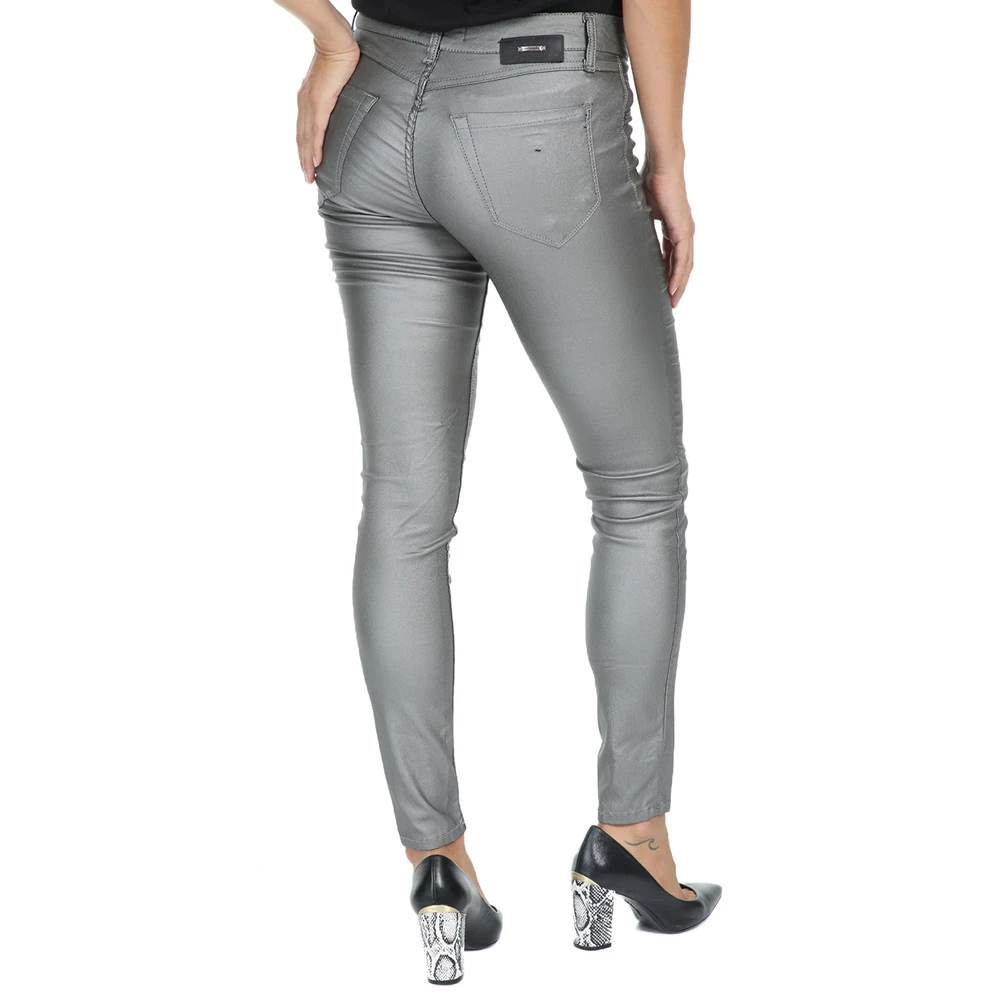 Γυναικείο παντελόνι IMPERIAL σε μεταλλική γκρι απόχρωση. Σε skinny γραμμή, με όψη δέρματος. Διαθέτει δύο τσέπες στα πλάγια και δύο τσέπες πίσω. Κλείνει με κουμπί και φερμουάρ μπροστά.