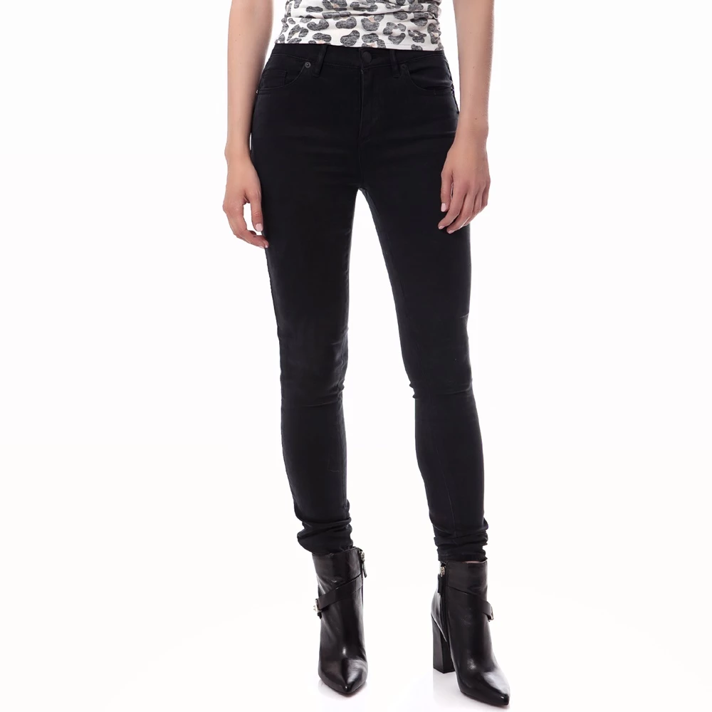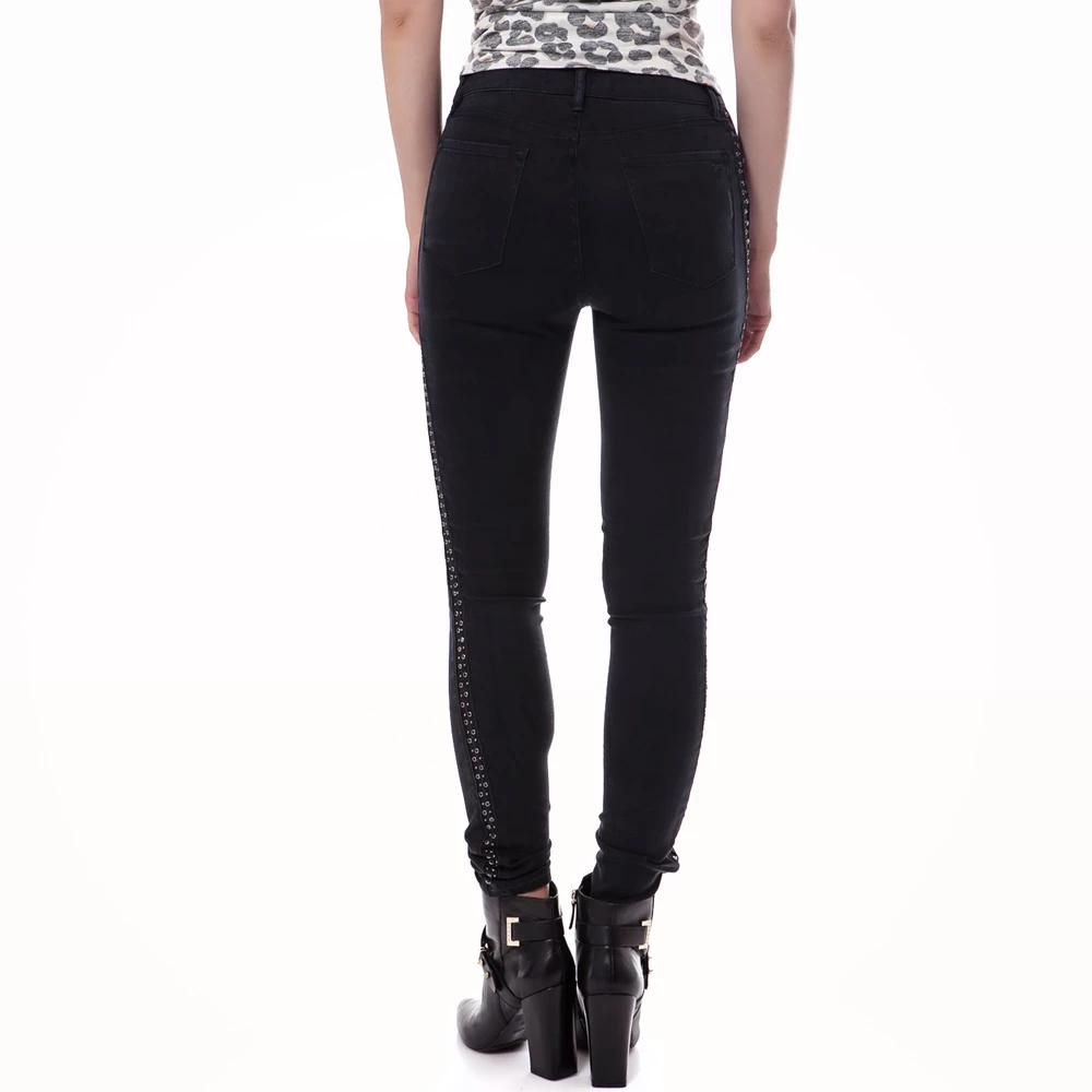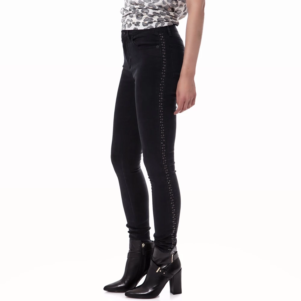 Ψηλόμεσο πντελόνι με στενή γραμμή σε μαύρο χρώμα και μεταλλικές λεπτομέρειες στο πλάι.