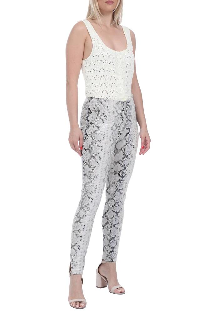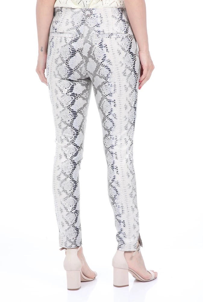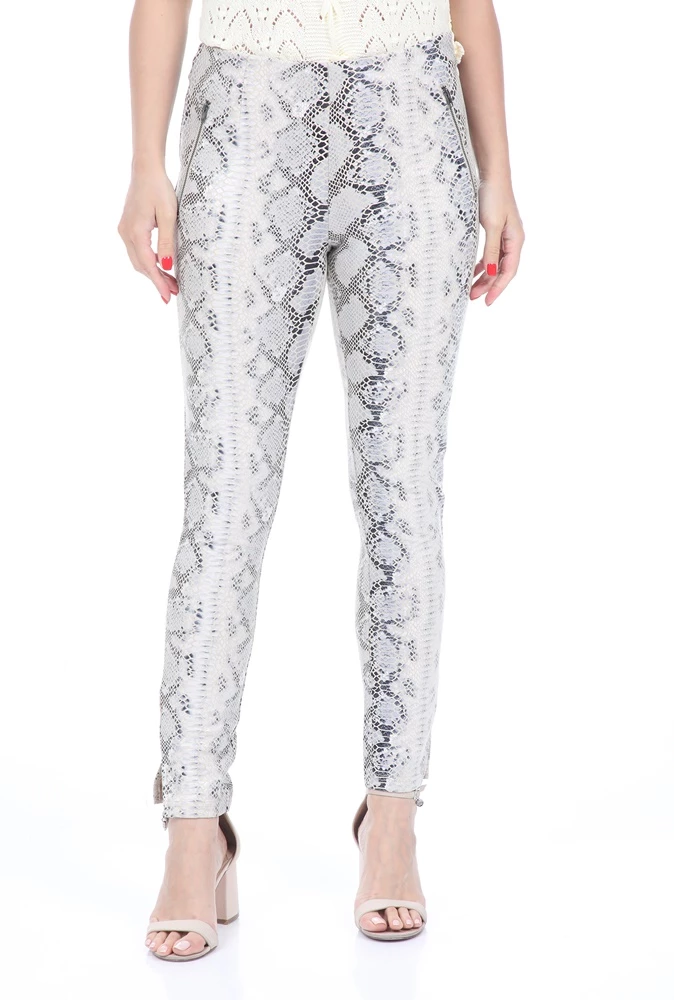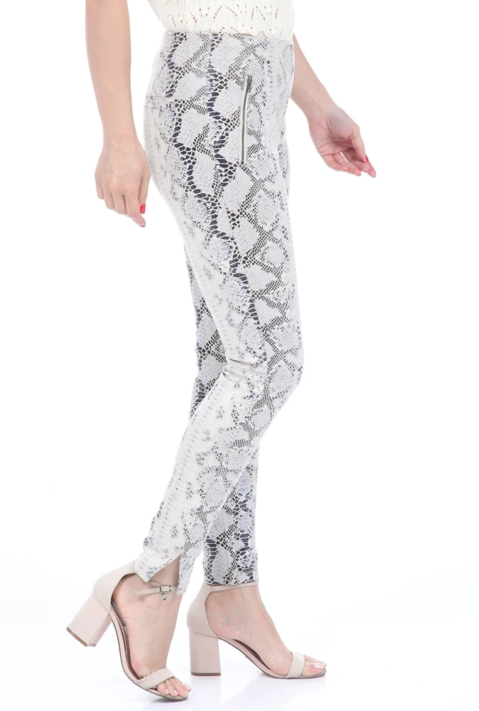 Γυναικείο παντελόνι κολάν KENDALL + KYLIE σε γκει και καφέ απόχρωση, με μοτίβο snakesin. Σε ίσια γραμμή, με slim εφαρμογή. Διαθέτει δύο τσέπες με φρμουάρ στα πλάγια και δύο τσέπες πίσω. Λάστιχο στη μέση και μικρά ανοίγματα στη βάση.