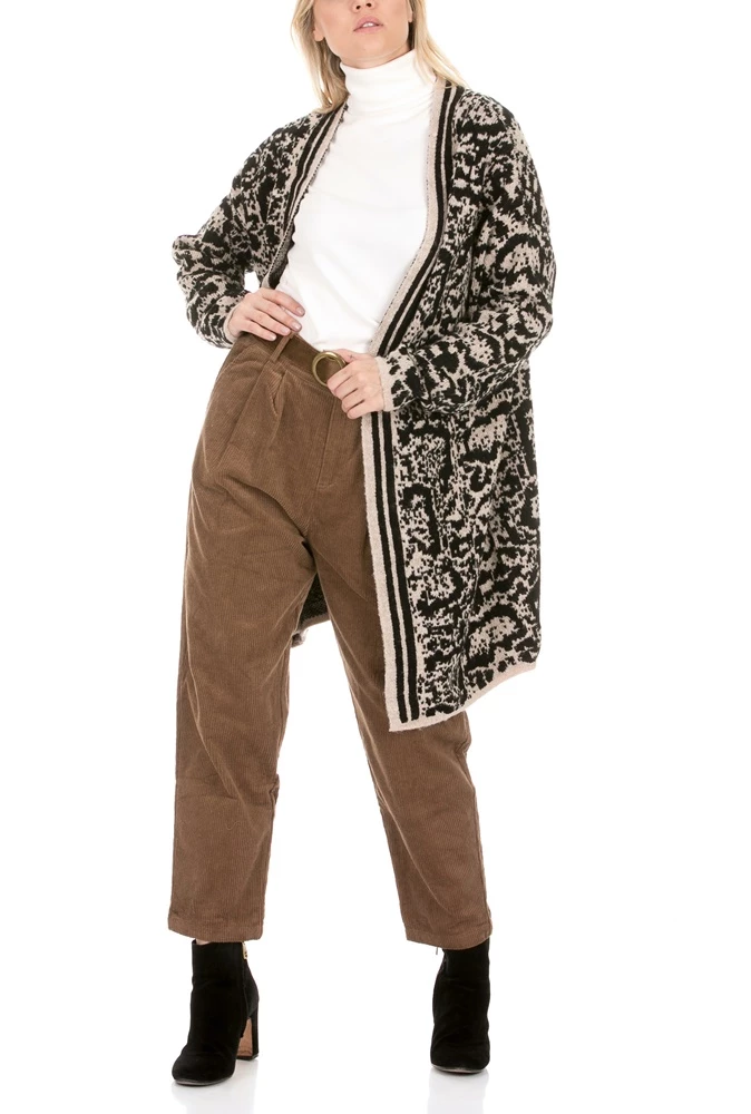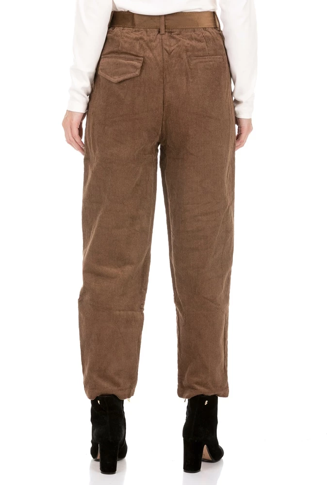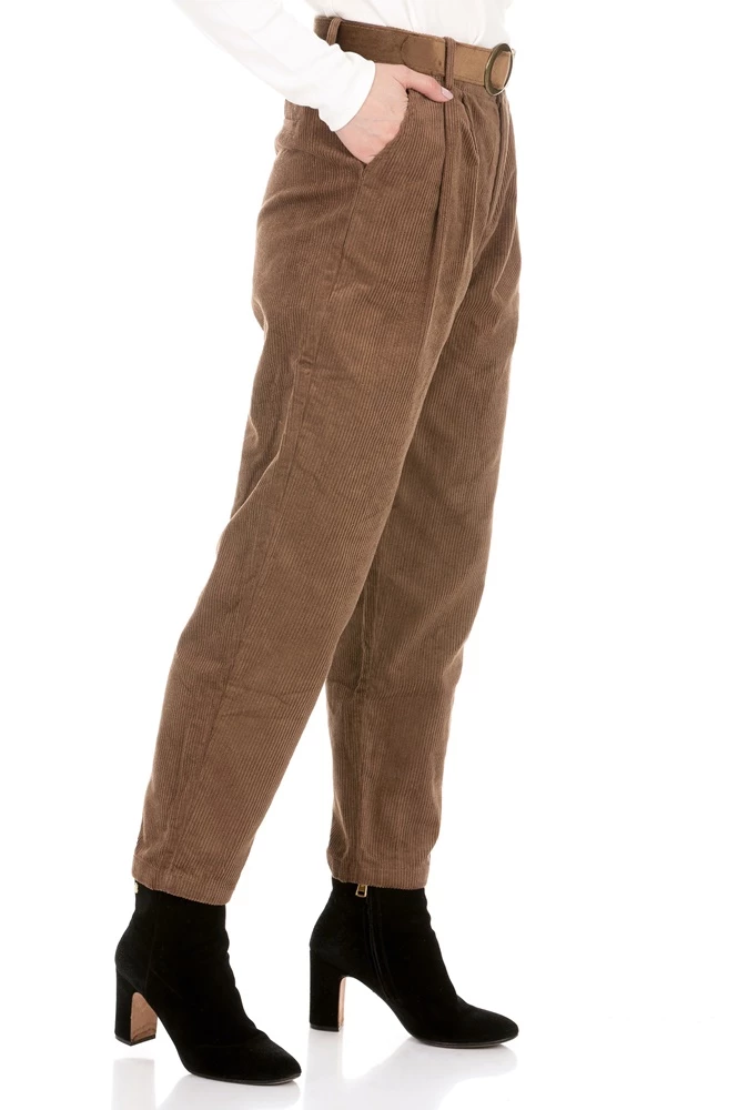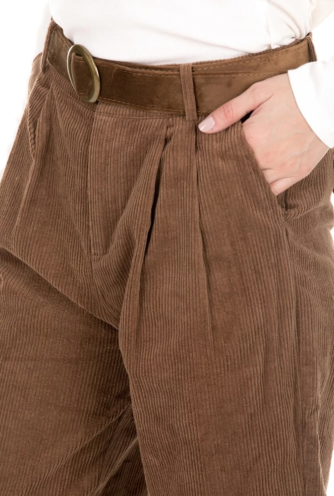 Γυναικείο παντελόνι MOLLY BRACKEN σε καφέ απόχρωση. Σε ίσια γαρμμή, από μαλακό κοτλέ ύφασμα. Είναι ψηλόμεσο, με μήκος μέχρι τον αστράγαλο. Διαθέτει δύο τσέπες στα πλάγια και δύο τσέπες πίσω. Ζώνη στην μέση με στρογγυλή μεταλλική αγκράφα. Κλείνει με κουμπί και φερμουάρ μπροστά.