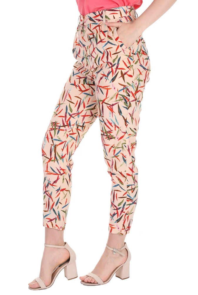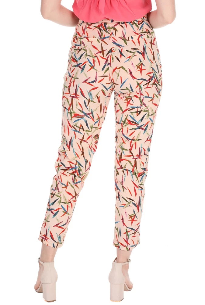 Γυναικείο παντελόνι MOLLY BRACKEN σε μπεζ ροζ απόχρωση, με πολύχρωμο μοτίβο από φύλλα σε όλη την επιφάνεια. Είναι ψηλόμεσο, σε chino γραμμή, με μήκος πάνω από τον αστράγαλο. Διαθέτει δύο τσέπες στα πλάγια και δύο τσέπες πίσω. Κλείνει με κουμπί και φερμουάρ μπροστά.