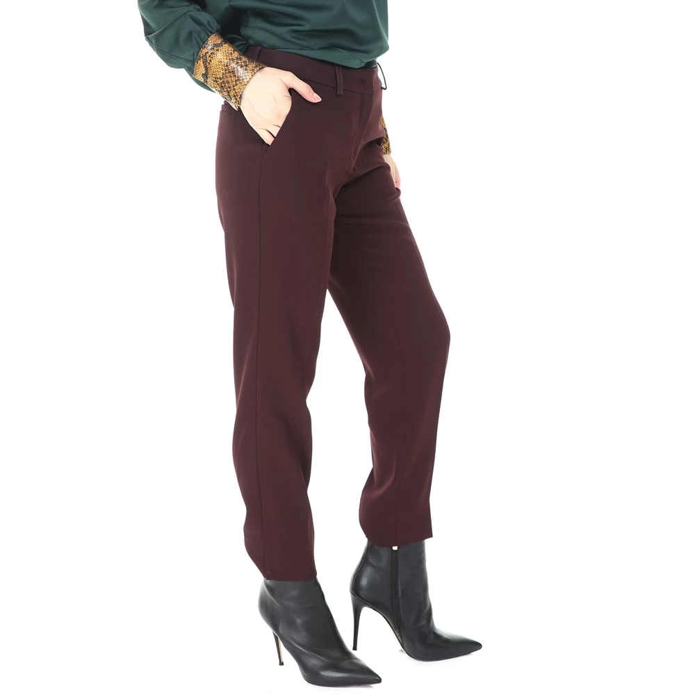 Γυναικείο παντελόνι σε μπορντό χρώμα. Είναι ψηλόμεσο σε ίσια γραμμή. Διαθέτει δύο τσέπες στα πλάγια και δύο τσέπες πίσω. Κλείνει με φερμουάρ μπροστά.