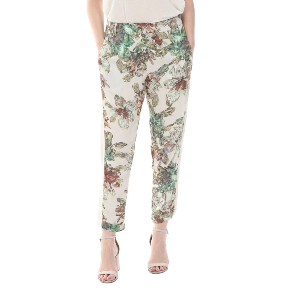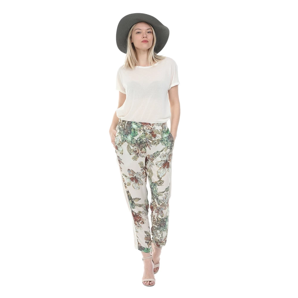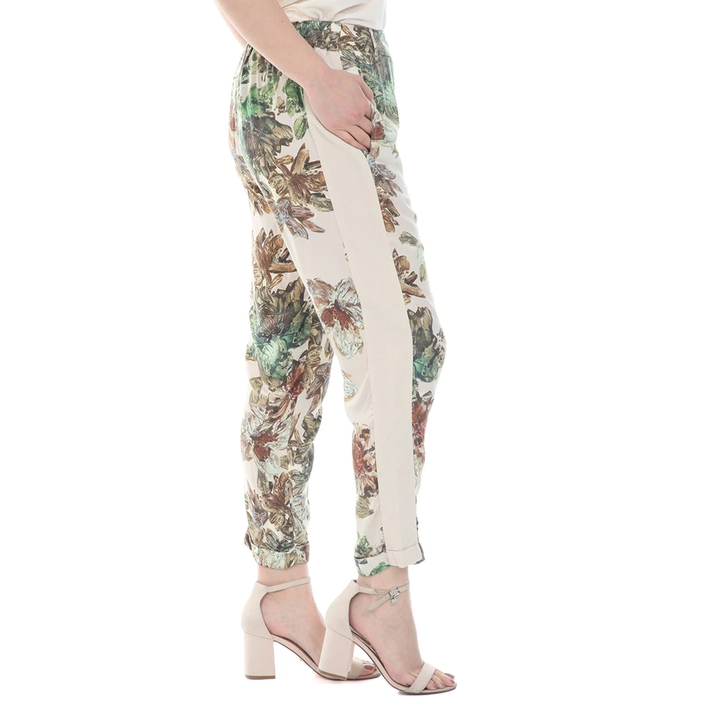 Γυναικείο παντελόνι NU σε μπεζ απόχρωση, με floral μοτίβο. Είναι ψηλόμεσο, με μήκος πάνω από τον αστράγαλο και ρεβέρ στο τελείωμα. Διαθέτει δύο τσέπες στα πλάγια και λάστιχο στη μέση.