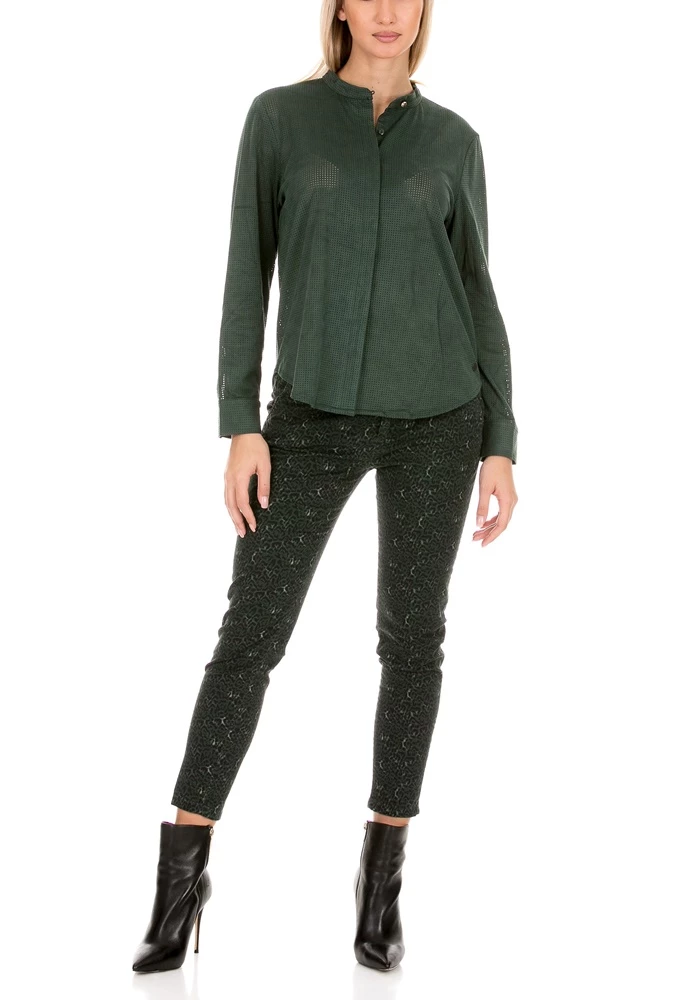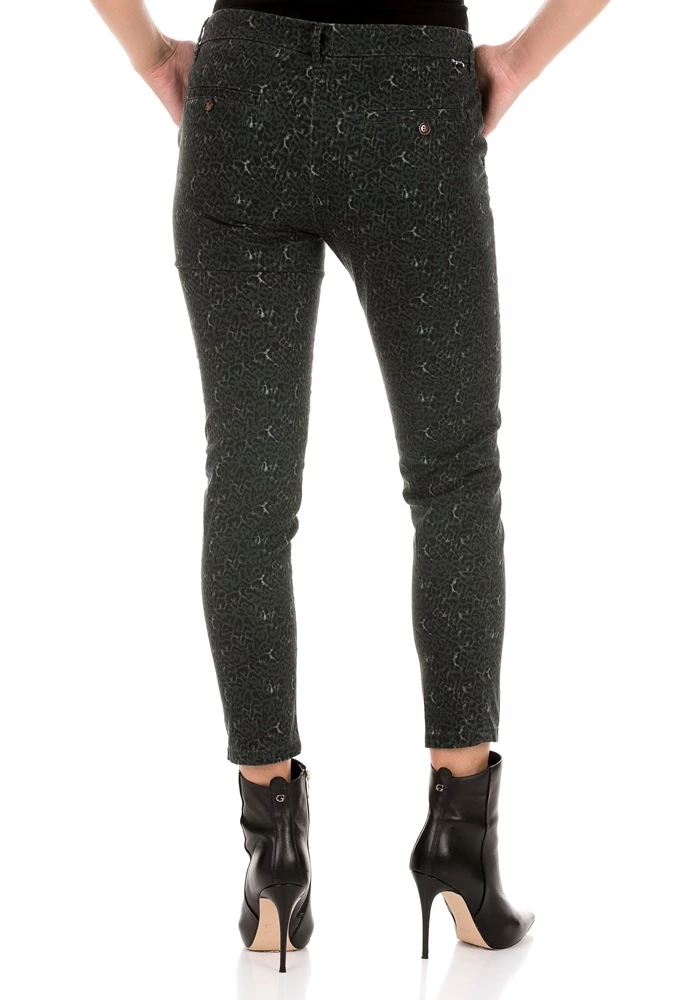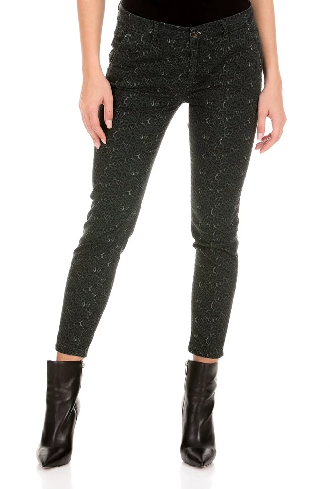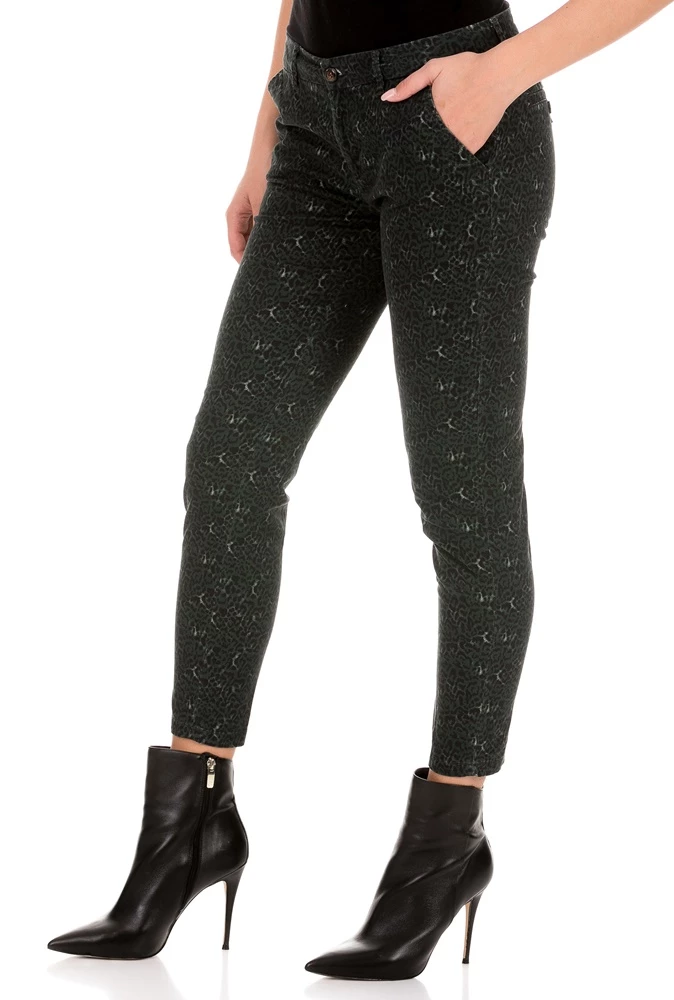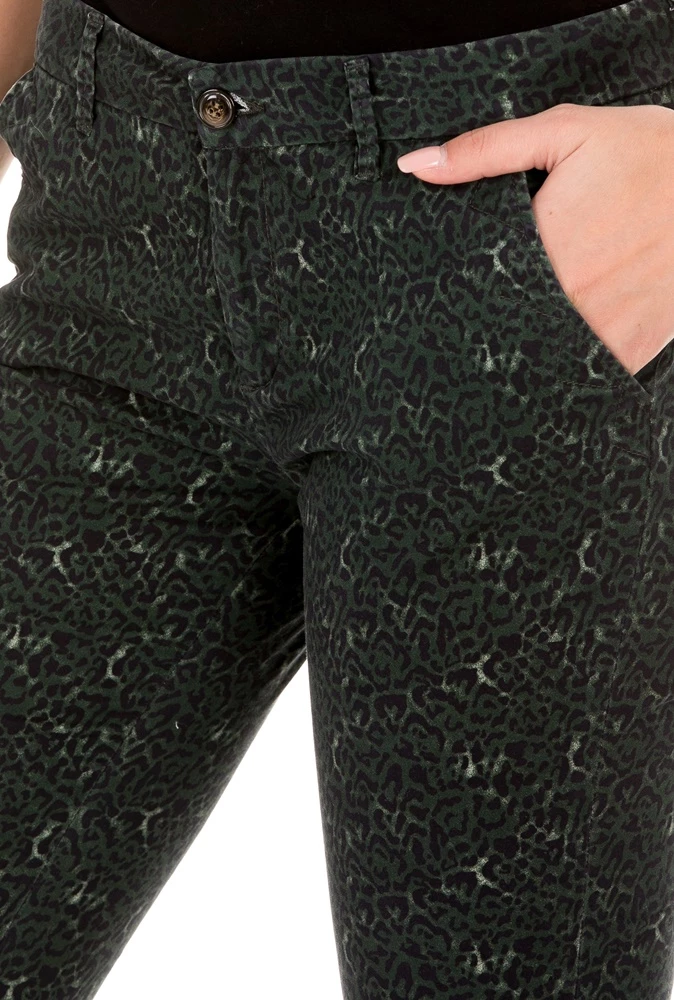Γυναικείο παντελόνι REIKO σε πράσινη απόχρωση με καφέ λεοπάρ μοτίβο. Slim εφαρμογή, με μήκος πάνω από τον αστράγαλο. Διαθέτει δύο τσέπες στα πλάγια και δύο τσέπες με κουμπάκια πίσω. Κλείνει με κουμπί και φερμουάρ μπροστά.