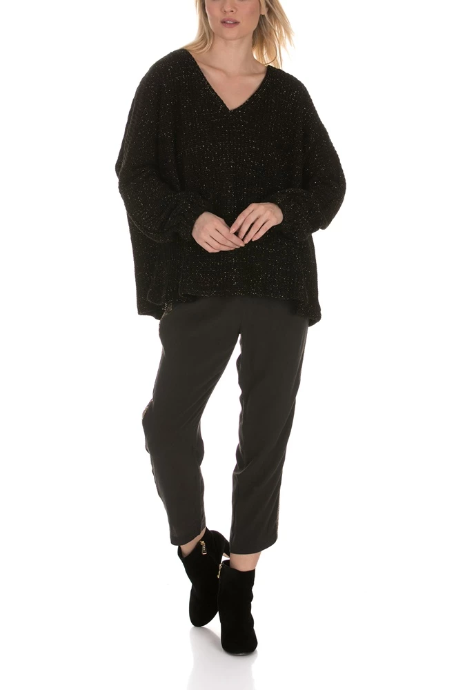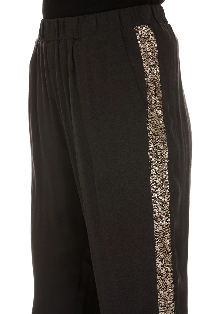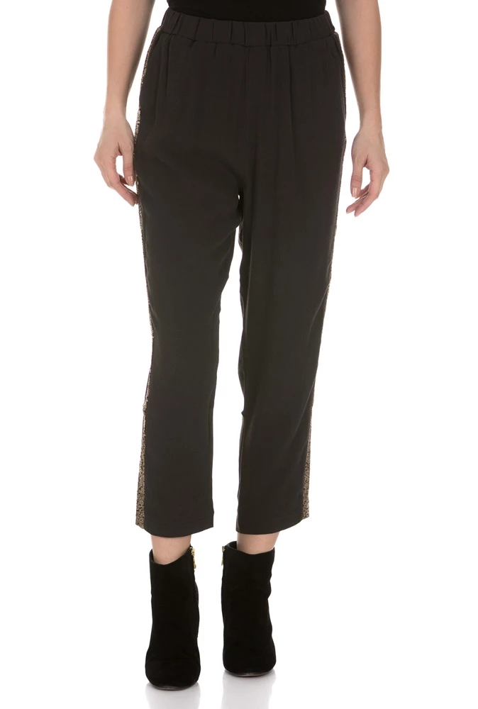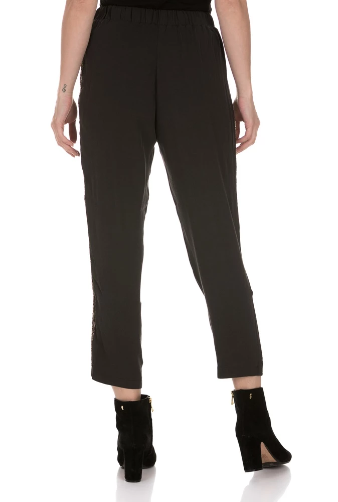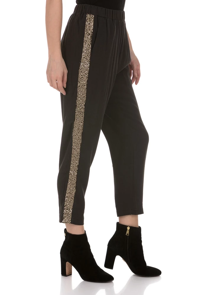 Γυναικείο παντελόνι σε μαύρη απόχρωση με λεπτομέρεια στο πλάι με χρυσές παγιέτες. Έχει ίσια γραμμή και είναι ιδανικό για το γραφείο.