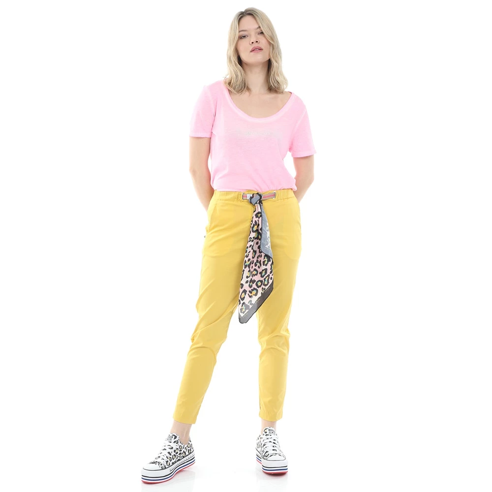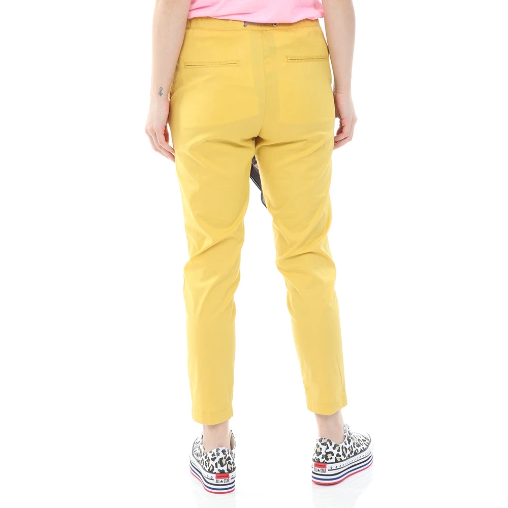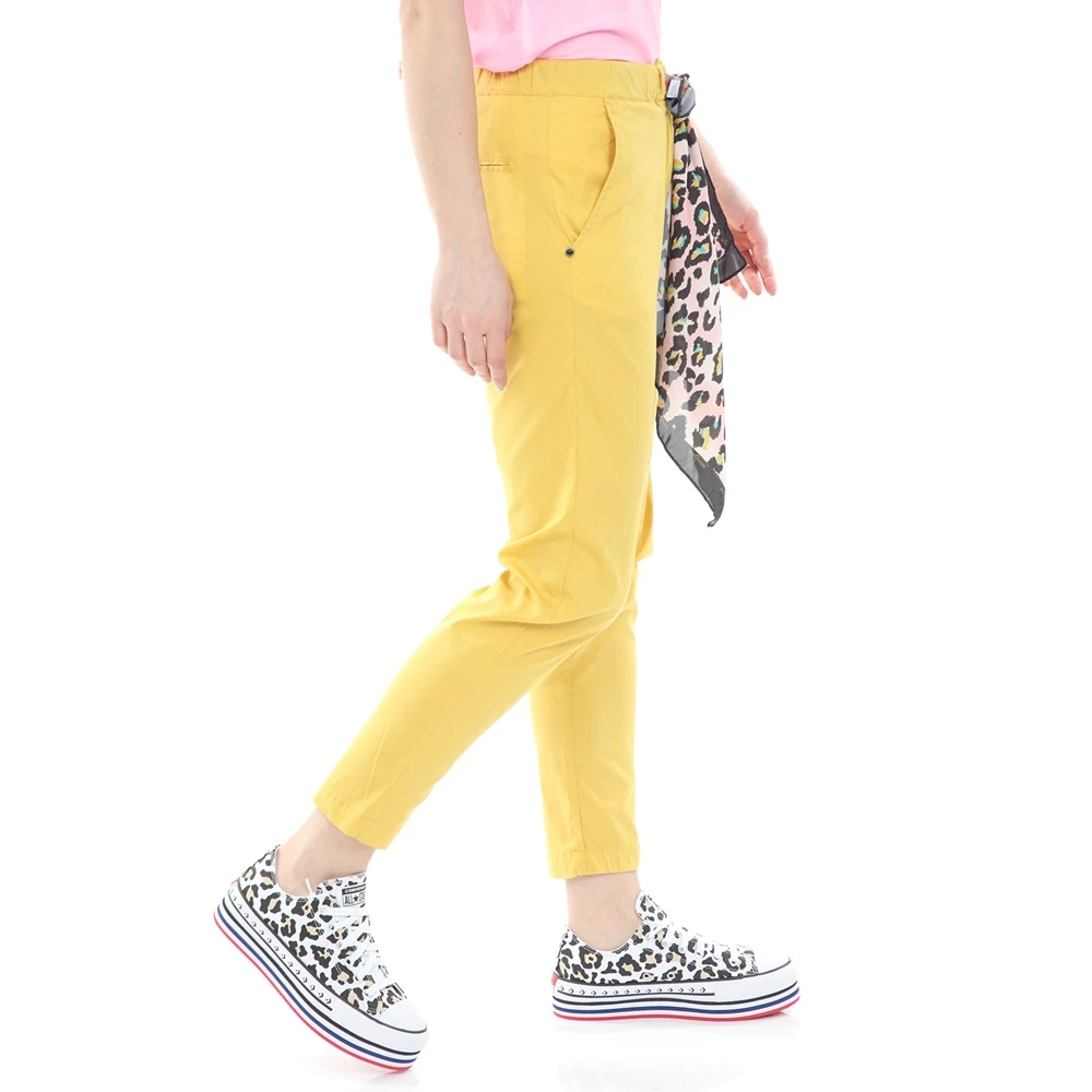Γυναικείο παντελόνι WHITE SAND σε κίτρινη απόχρωση. Σε γραμμή chino, με slim εφαρμογή και μήκος πάνω από τον αστράγαλο. Διαθέτει τσέπες στα πλάγια και πίσω, και λάστιχο με εμπριμέ φουλάρι στη μέση, που δένει μπροστά. Κλείνει με φερμουάρ.