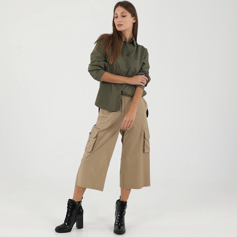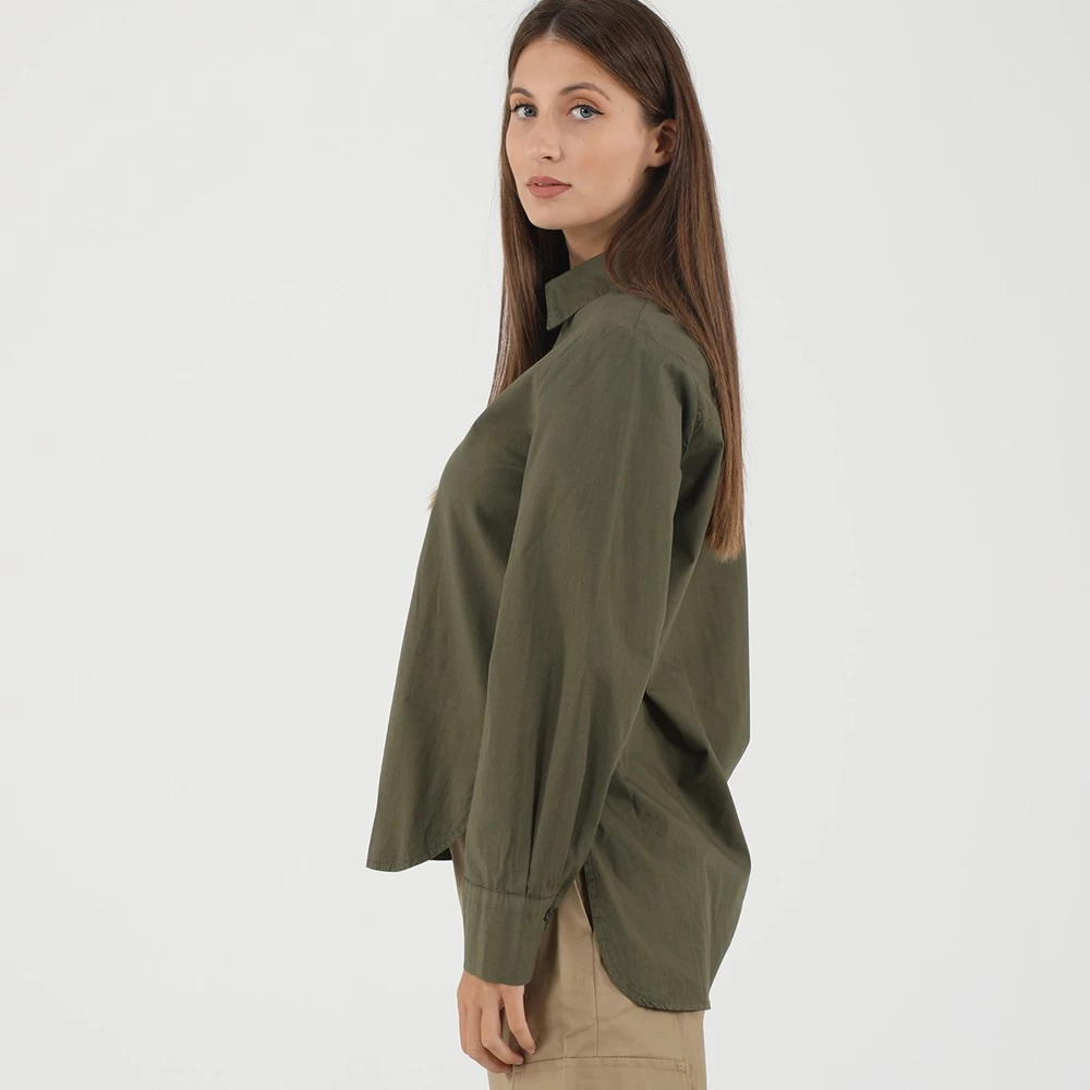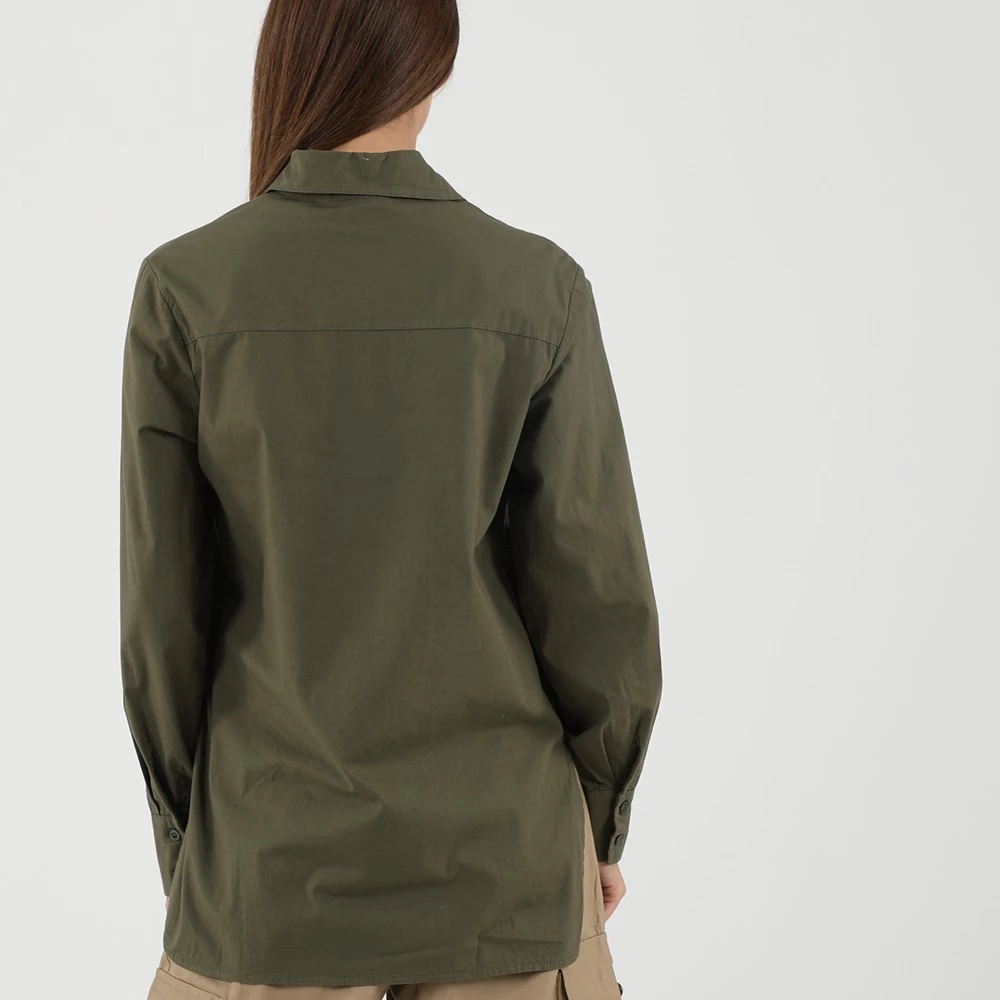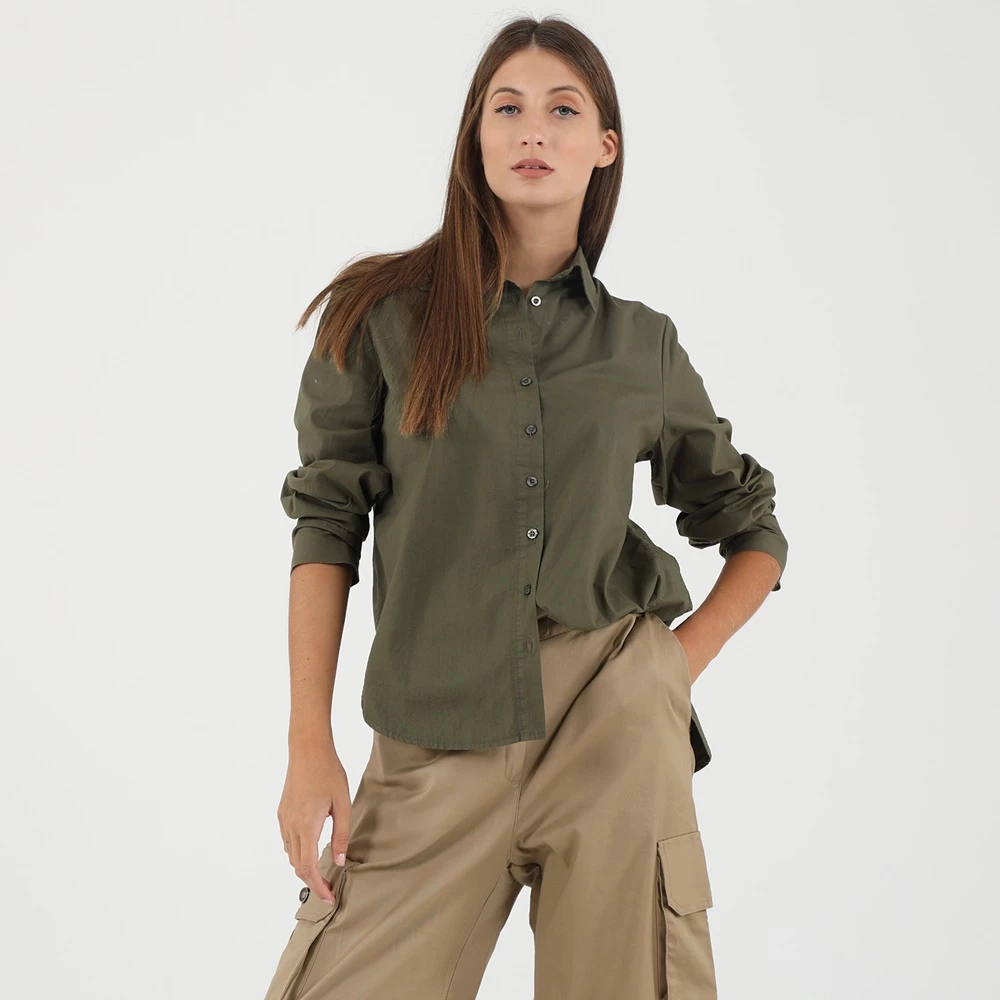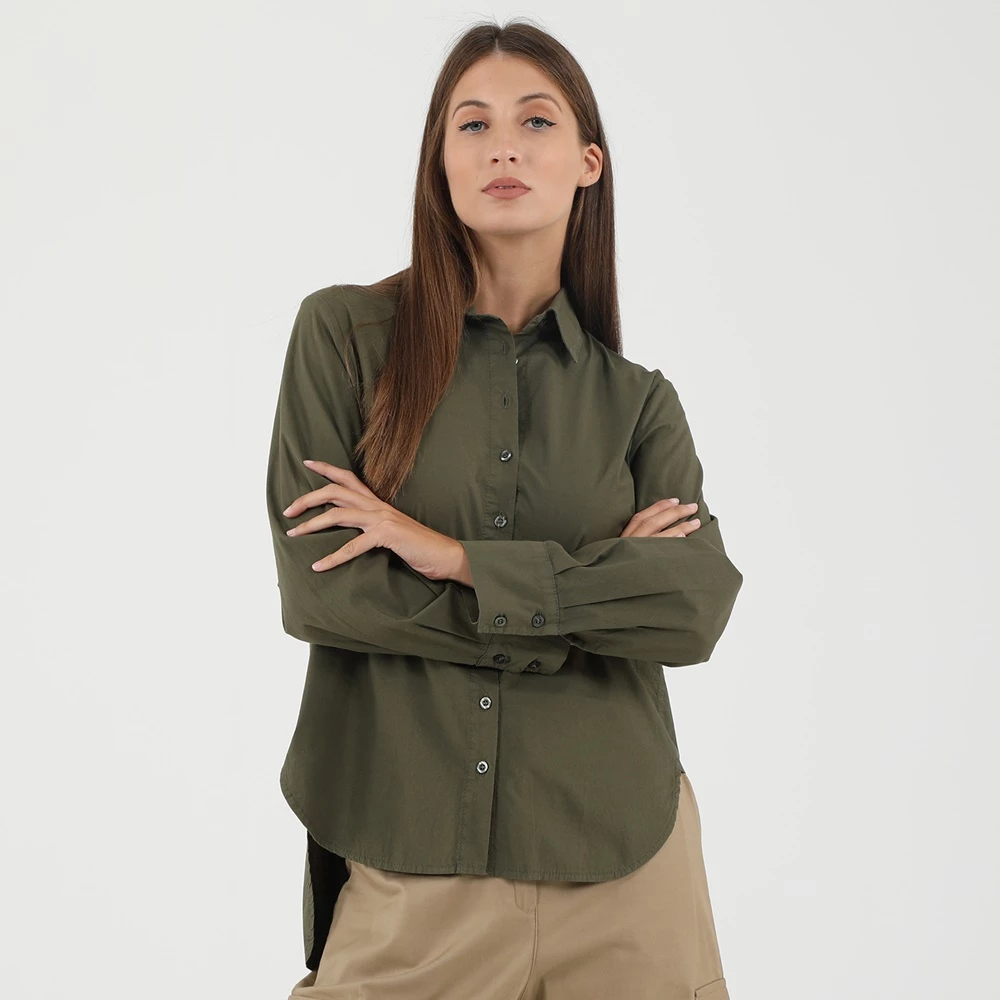 Γυναικείο πουκάμισο ATTRATTIVO σε χακί απόχρωση. Από βαμβακερή σύνθεση, με μακρύτερο μήκος πίσω. Έχει μακριά μανίκια και κλασικό γιακά με μυτερές άκρες. Κλείνει με κουμπιά μπροστά.