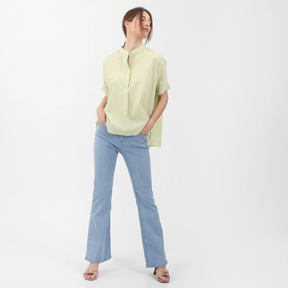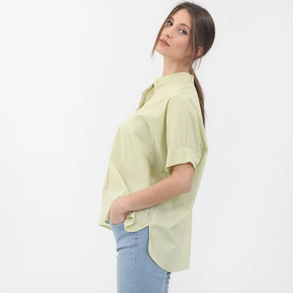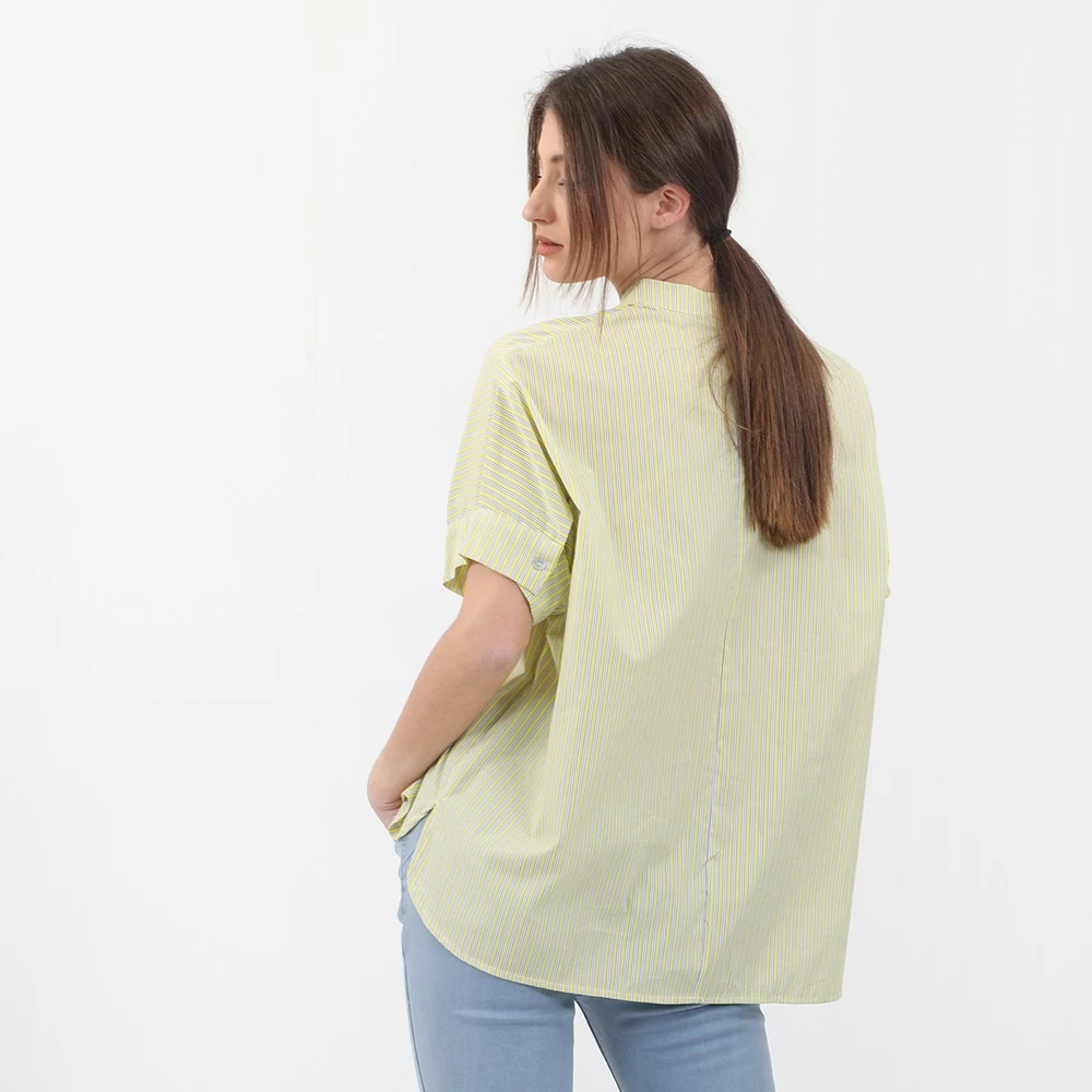 Γυναικείο πουκάμισο ATTRATTIVO σε κίτρινη απόχρωση, με μπλε ριγέ μοτίβο. Σε άνετη γραμμή, με μακρύτερο μήκος πίσω. Έχει κοντά μανίκια, mao γιακά και κουμπάκια στην λαιμόκοψη.
