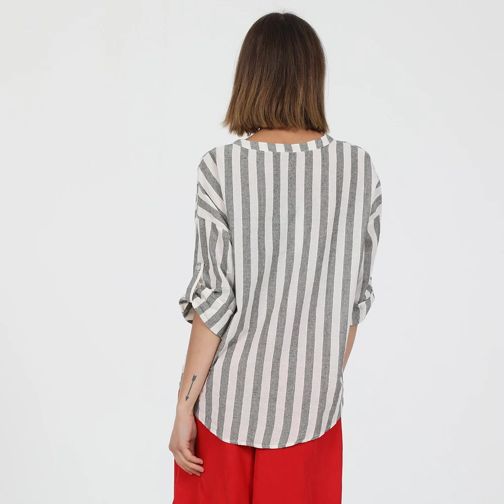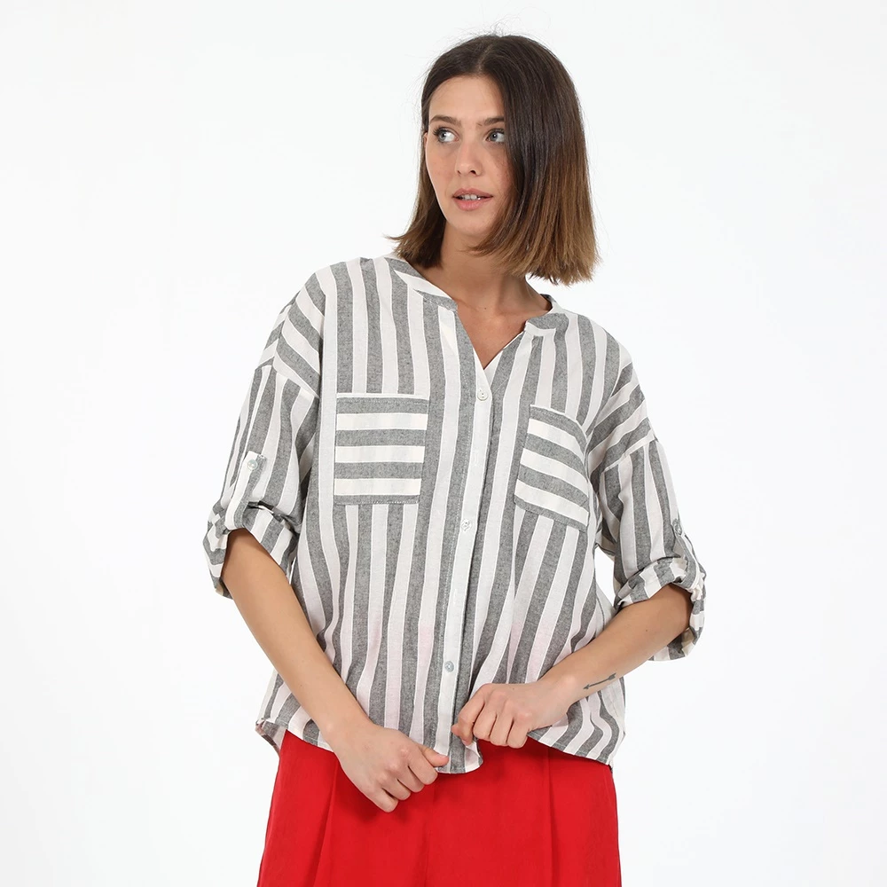 Γυναικείο πουκάμισο ATTRATTIVO σε εκρού απόχρωση, με ριγέ μοτίβο. Σε ίσια και άνετη γραμμή, με μακρύτερο μήκος πίσω. Έχει μανίκια 7/8, mao γιακά και V λαιμόκοψη. Κλείνει με κουμπιά μπροστά.