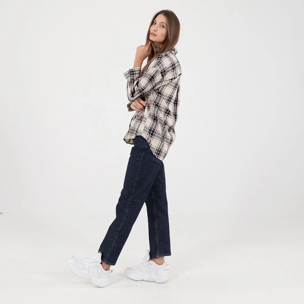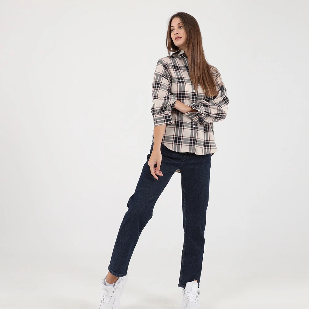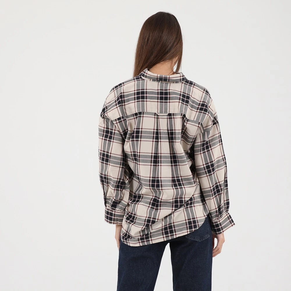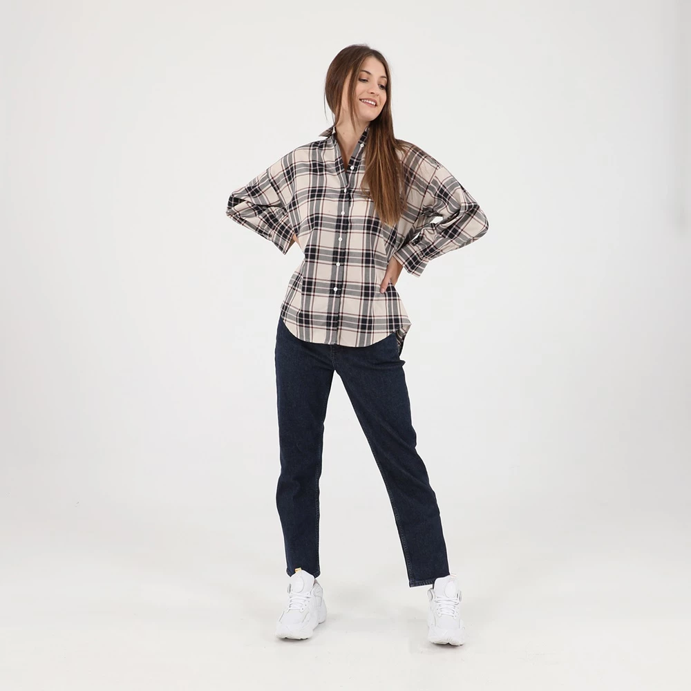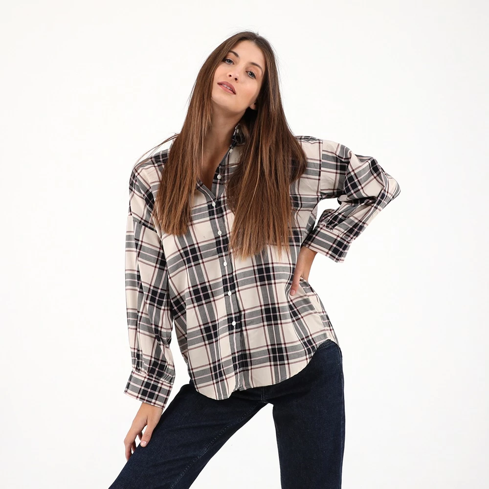 Γυναικείο πουκάμισο GANT σε εκρού απόχρωση, με μεγάλο καρό ροζ και μαύρο μοτίβο. Σε loose γραμμή, με μακριά μανίκια και κλασικό γιακά με μυτερές άκρες. Κλείνει με κουμπάκια μπροστά.