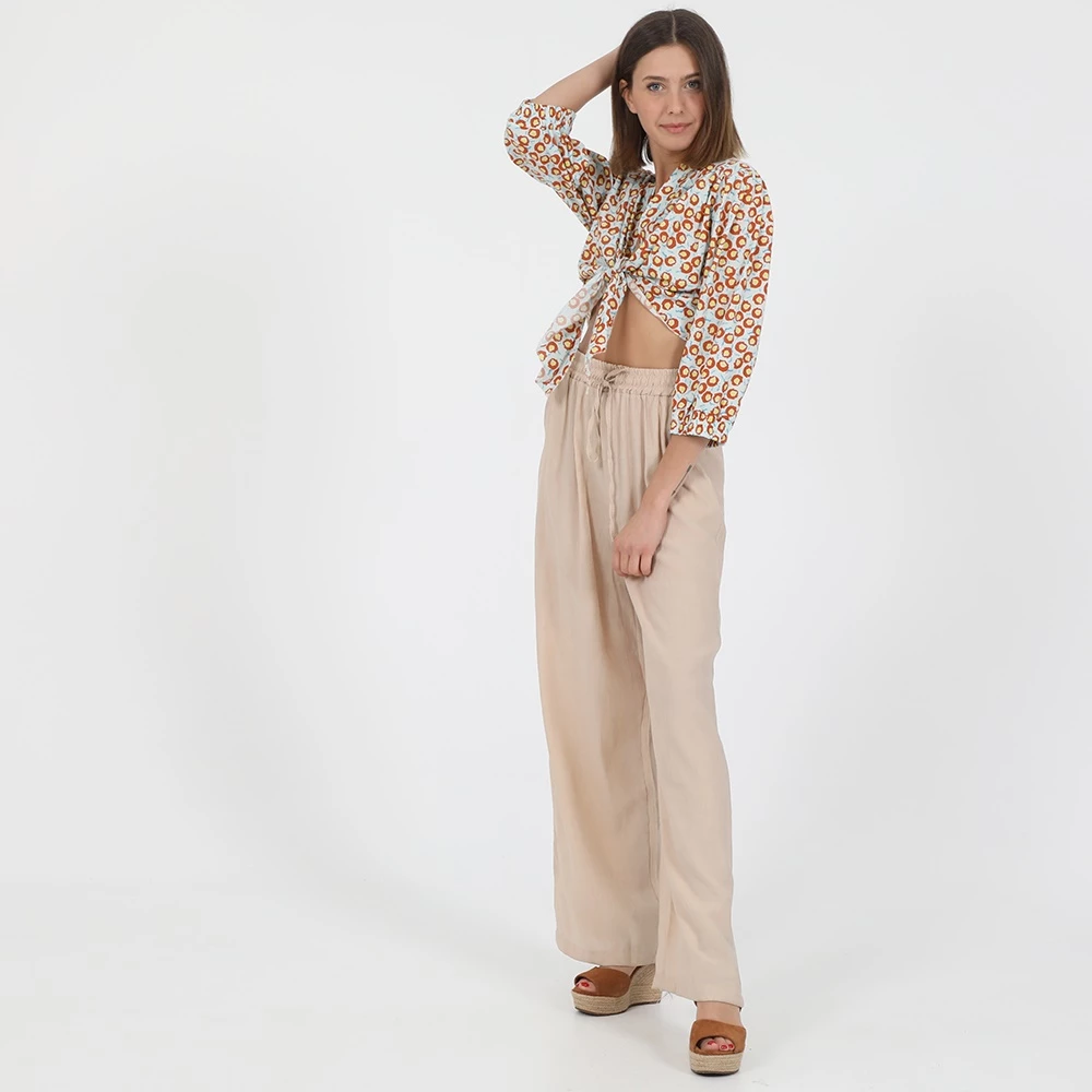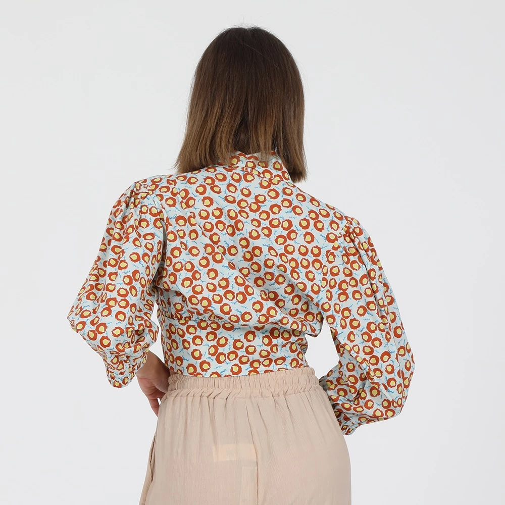Γυναικείο πουκάμισο μπολερό ATTRATTIVO σε μπεζ απόχρωση, με πορτοκαλί και κίτρινο floral μοτίβο. Έχει φαρδιά μανίκια μέχρι τους αγκώνες και μικρό mao γιακά. Δένει με κορδέλα μπροστά.