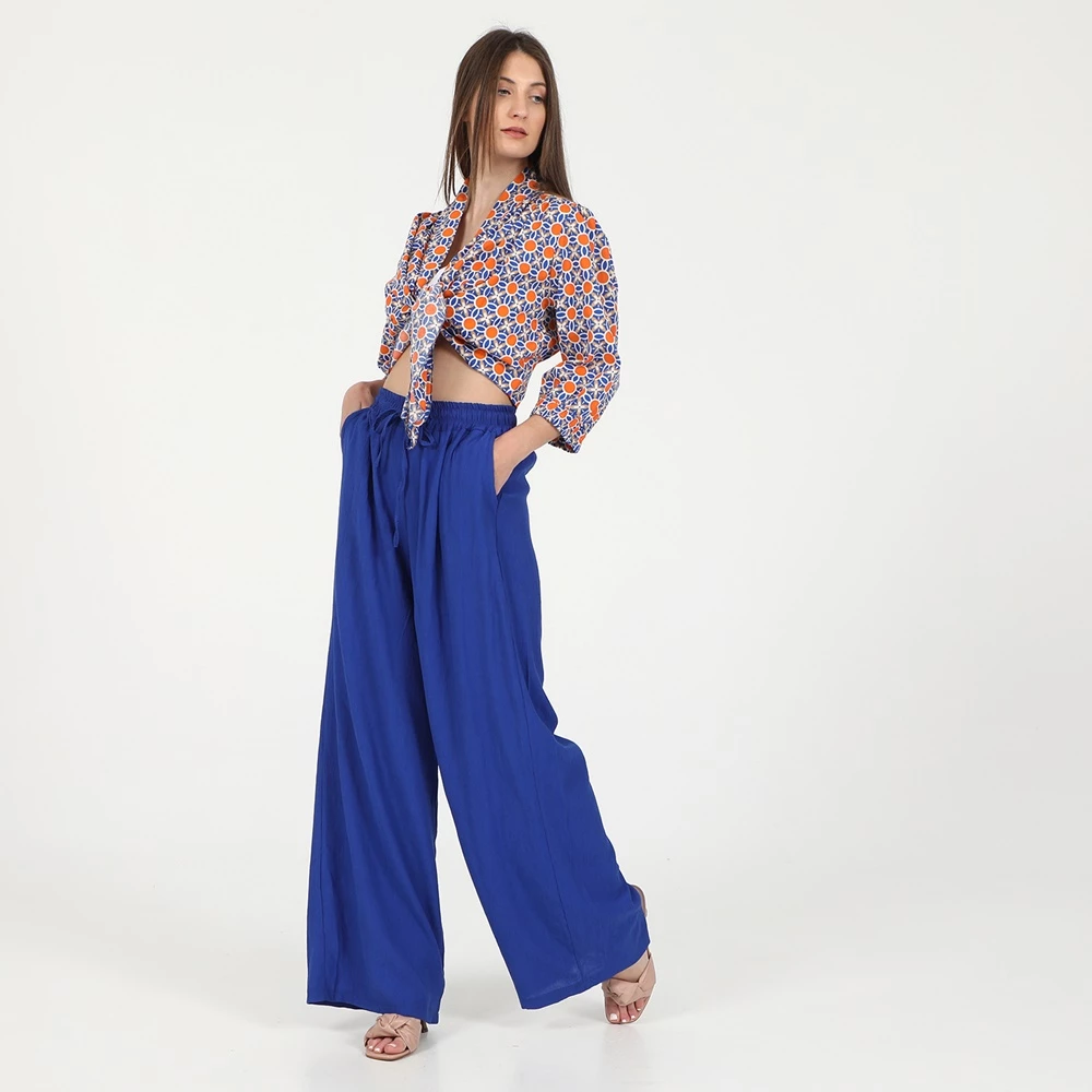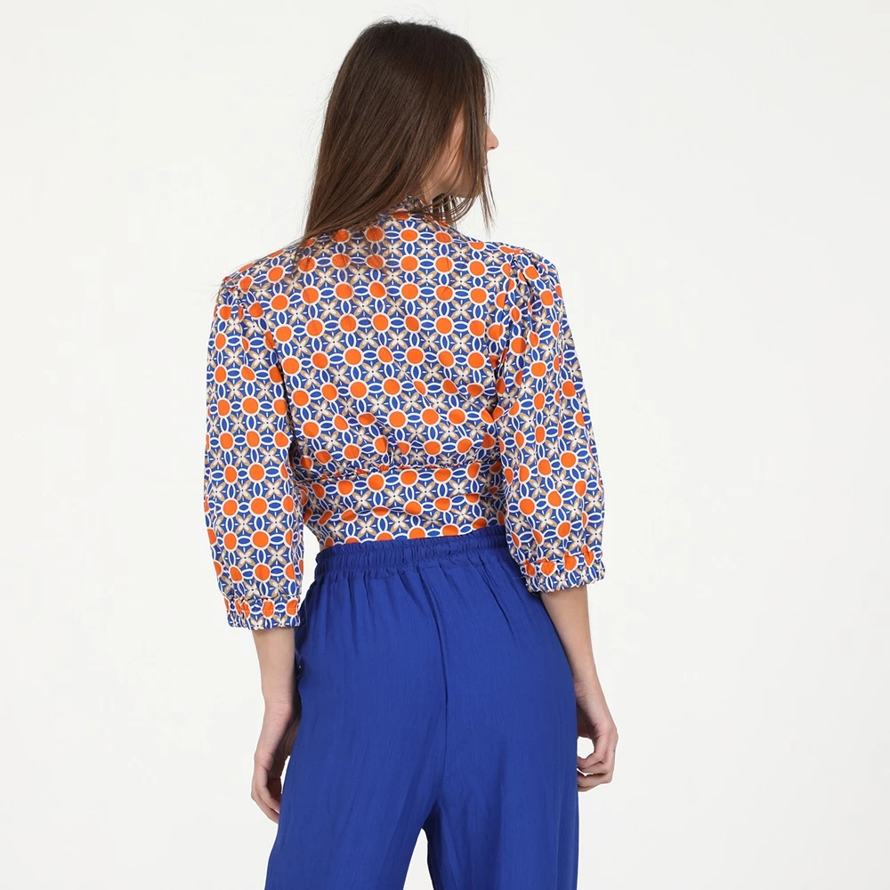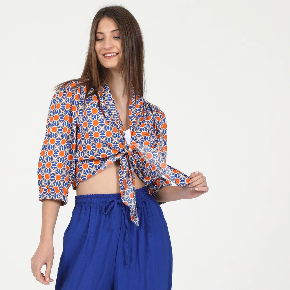 Γυναικείο πουκάμισο μπολερό ATTRATTIVO σε μπλε και πορτοκαλί χρώμα. Έχει φαρδιά μανίκια μέχρι τους αγκώνες και μικρό mao γιακά. Δένει με κορδέλα μπροστά.