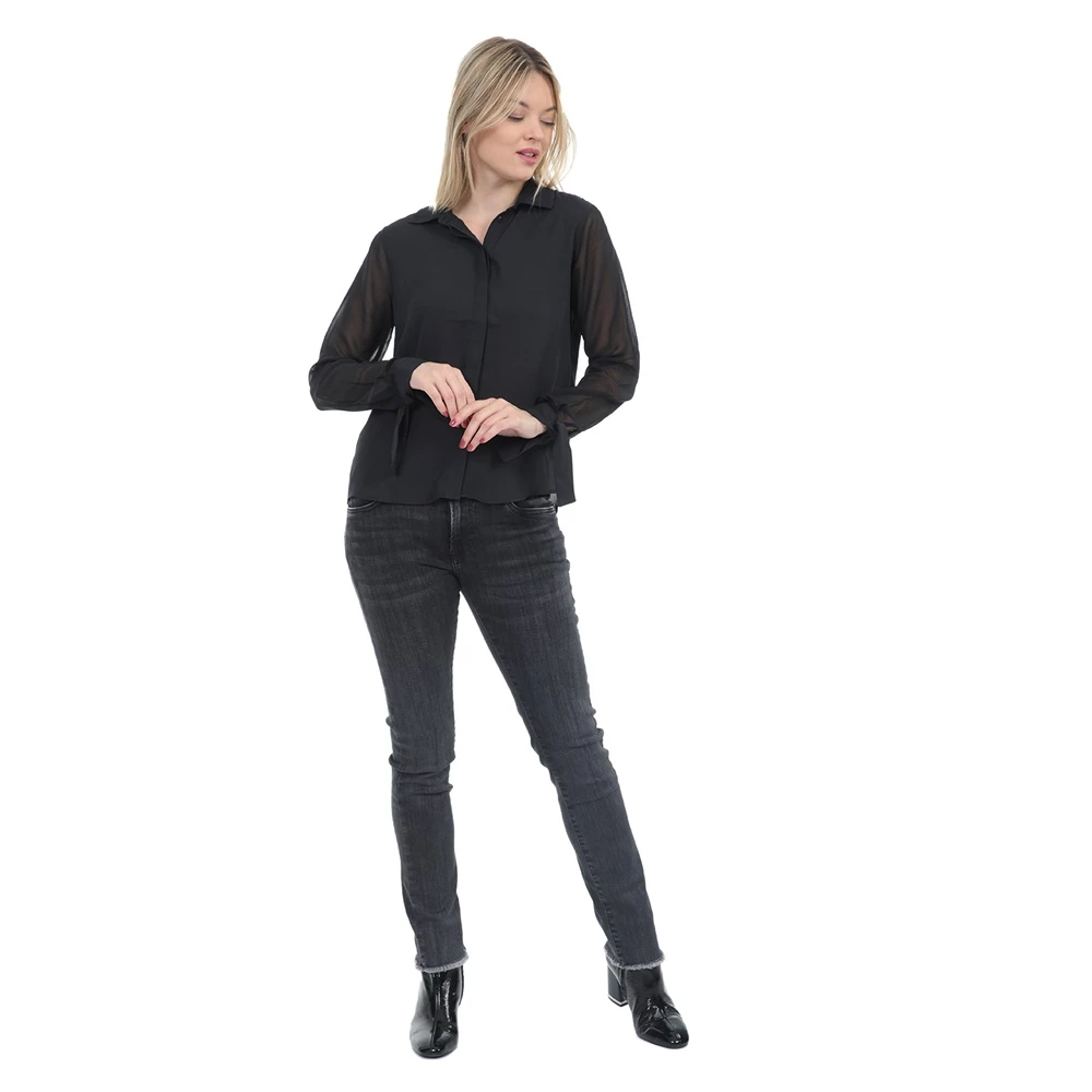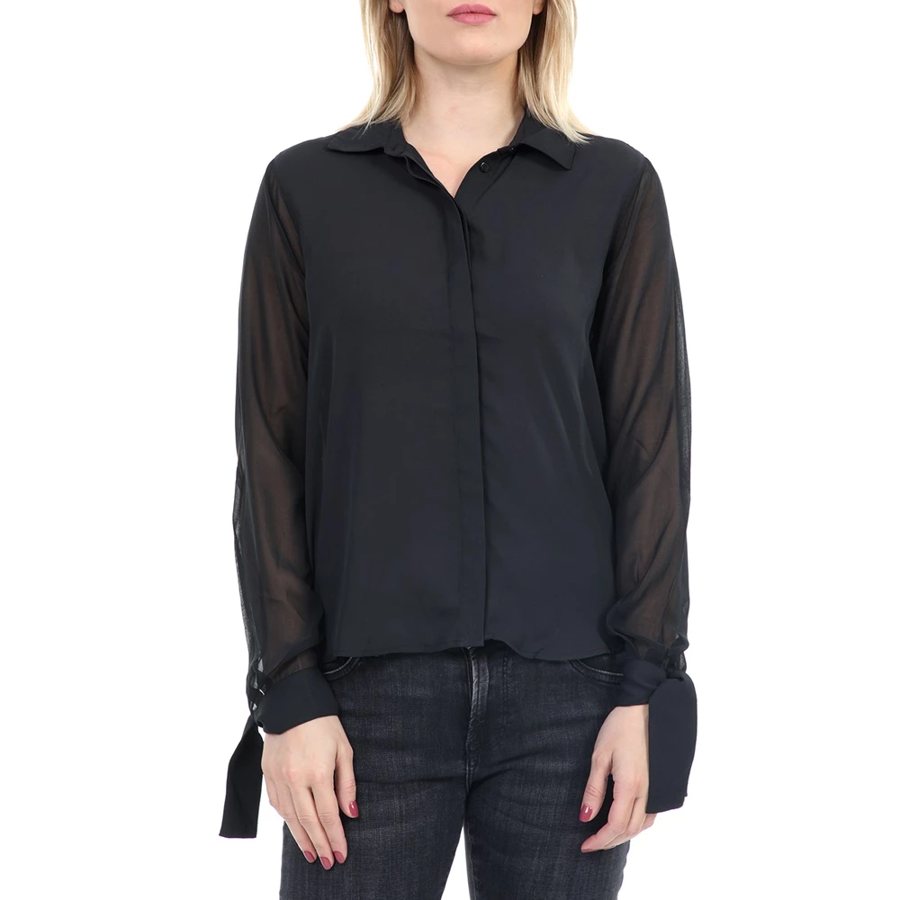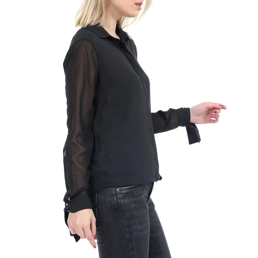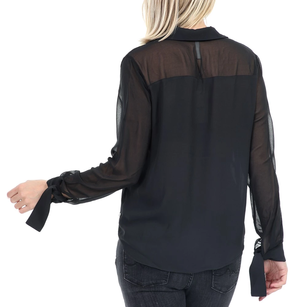 Γυναικείο πουκάμισο σε μαύρο χρώμα με διαφάνεια στα μανίκια και πατιλέτα για κρυφά κουμπιά μπροστά. Το δέσιμο στις μανσέτες δίνουν έξτρα στιλ.