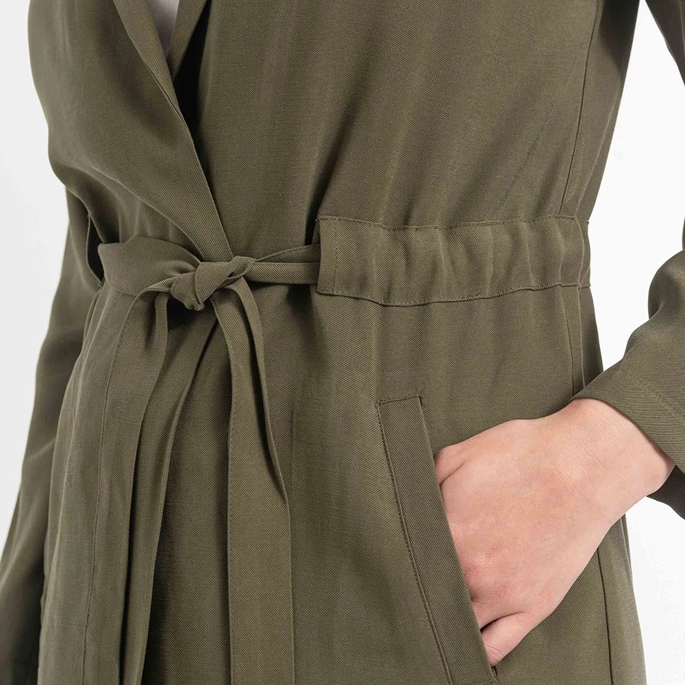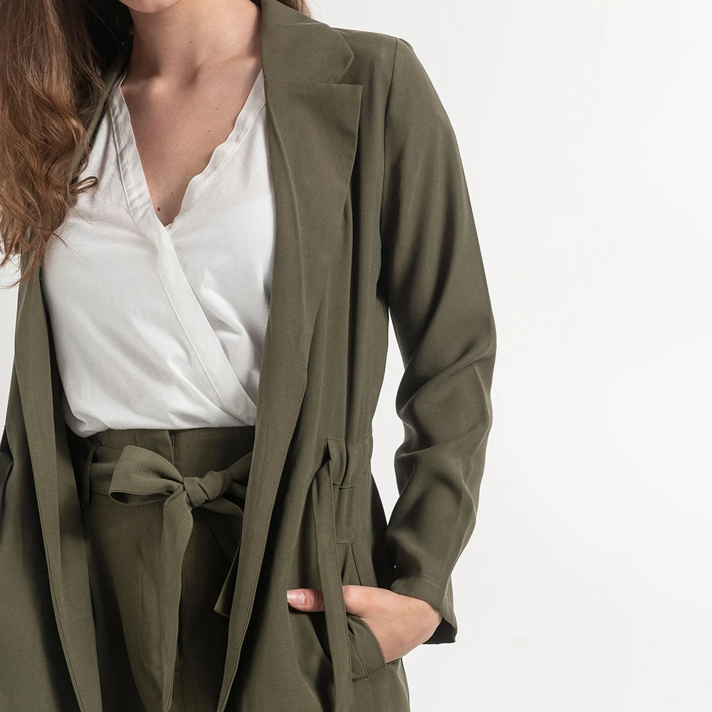 Γυναικείο σακάκι ATTRATTIVO σε χακί απόχρωση. Σε ίσια γραμμή, με μακριά μανίκια και κλασικό γιακά με πέτο. Διαθέτει δύο τσέπες στα πλάγια και ζώνη στη μέση.
