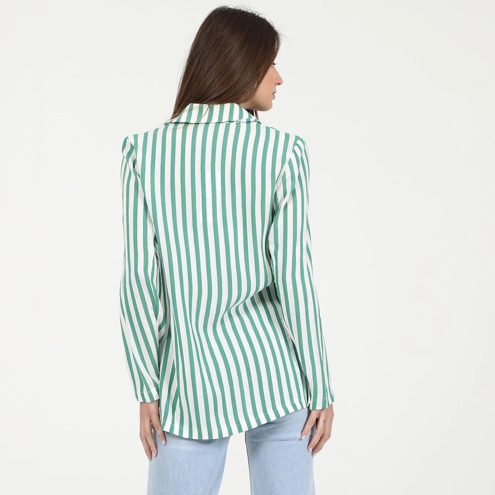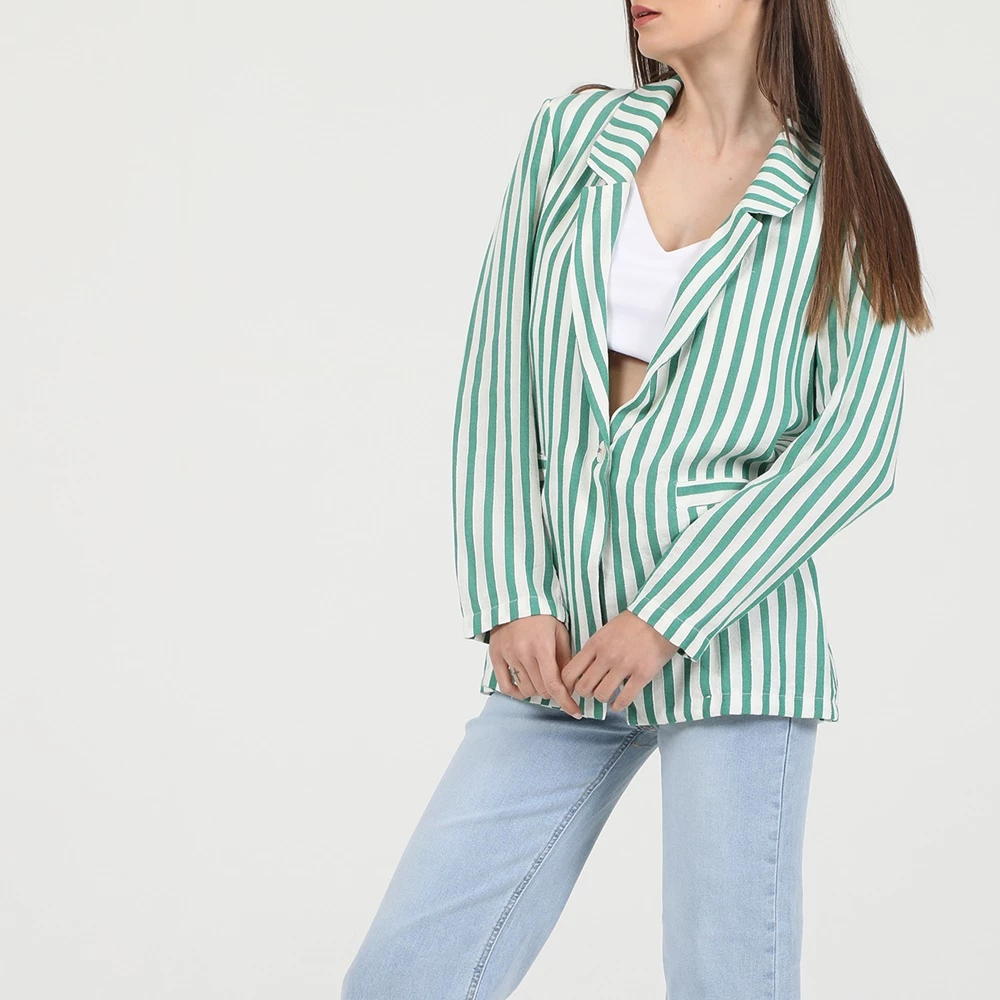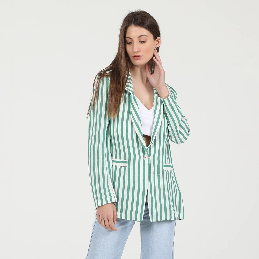 Γυναικείο σακάκι ATTRATTIVO σε λευκό και πράσινο χρώμα, με ριγέ μοτίβο. Σε ίσια γαρμμή, από λινή σύνθεση. Έχει μακριά μανίκια και κλασικό γιακά με πέτο. Διαθέτει δύο τσέπες στα πλάγια και κλείνει με ένα κουμπί μπροστά.