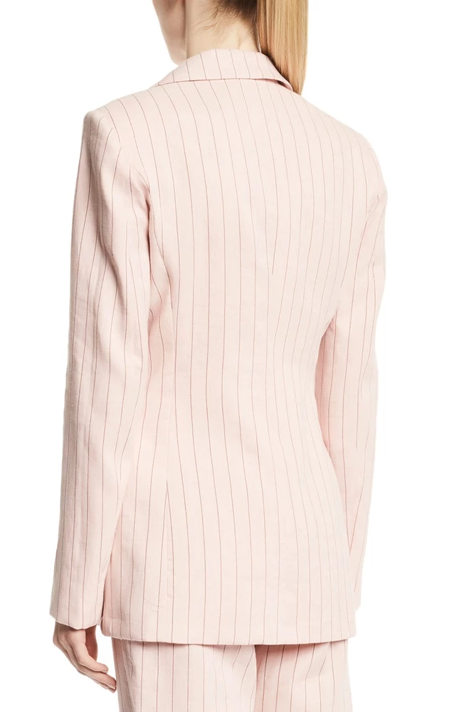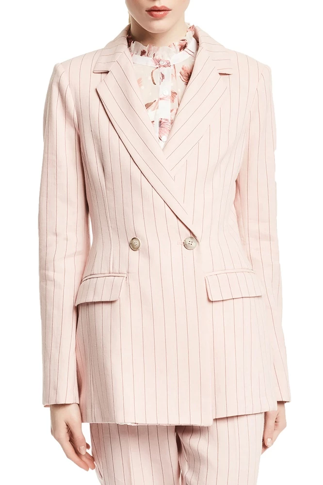 Γυναικείο σακάκι GAUDI σε ροζ απόχρωση, με καφέ ριγέ μοτίβο. Από λινή και βαμβακερή σύνθεση, με μεσάτη εφαρμογή. Έχει μακριά μανίκια και κλασικό γιακά με πέτο. Διαθέτει δύο τσέπες με καπάκι στα πλάγια και κλείνει με σταυρωτό κούμπωμα μπροστά.