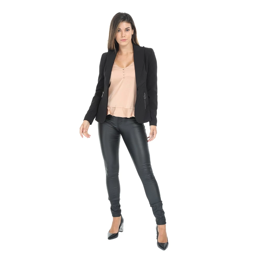 Γυναικείο σακάκι IMPERIAL σε μαύρο χρώμα. Σε ίσια γραμμή, με μεσάτη εφαρμογή. Έχει μακριά μανίκια και κλασικό γιακά με πέτο. Διαθέτει δύο τσέπες με φερμουάρ στα πλαϊνά και κλείνει με ένα κουμπί μπροστά.