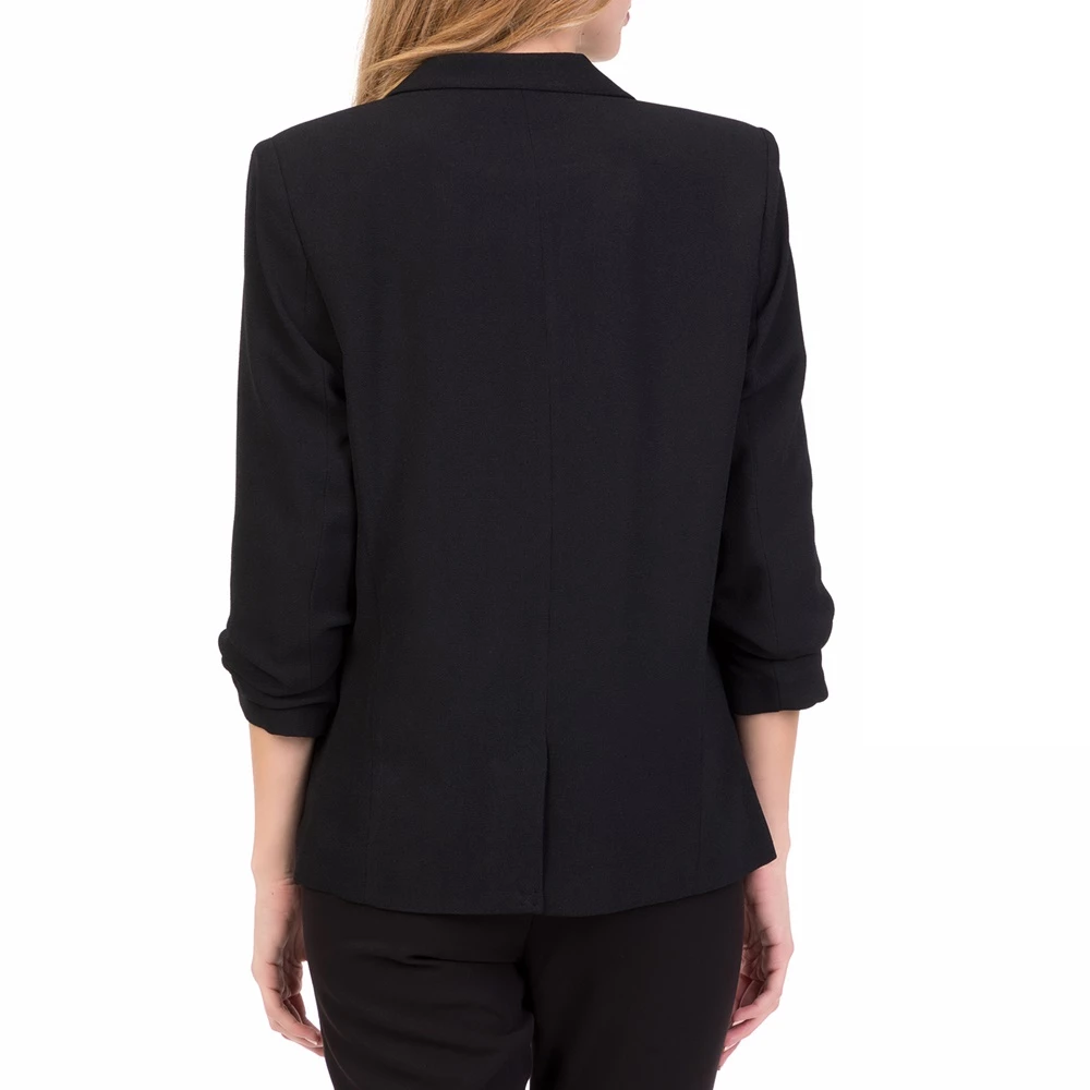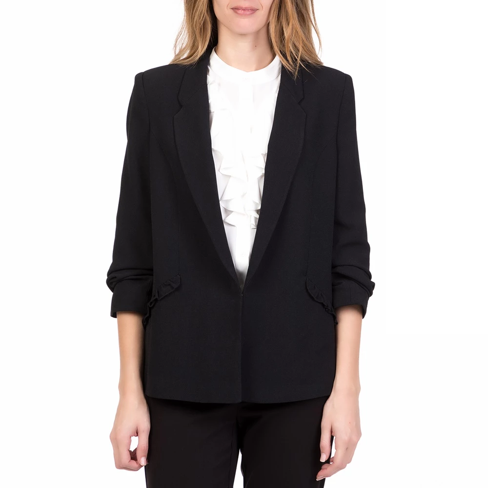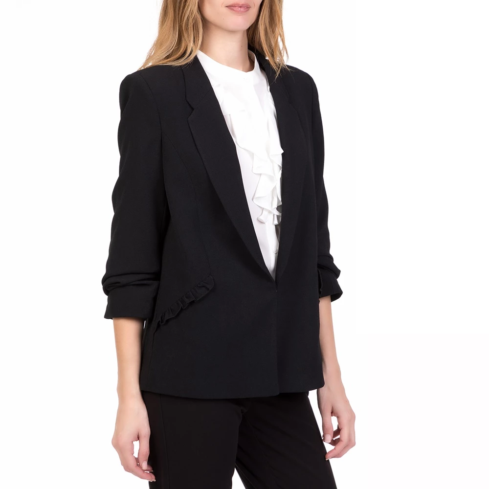 Γυναικείο σακάκι σε μαύρο χρώμα, με ίσια γραμμή, τρουακάρ μανίκια με σούρα και διακοσμητικά βολάν αντί για τσέπες. Έχει κλασικό γιακά και κλείσιμο μπροστά με ένα κουμπί. Ένα κομμάτι που θα φορέσεις εύκολα από το πρωί μέχρι το βράδυ.