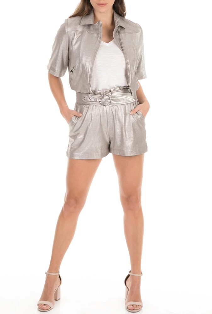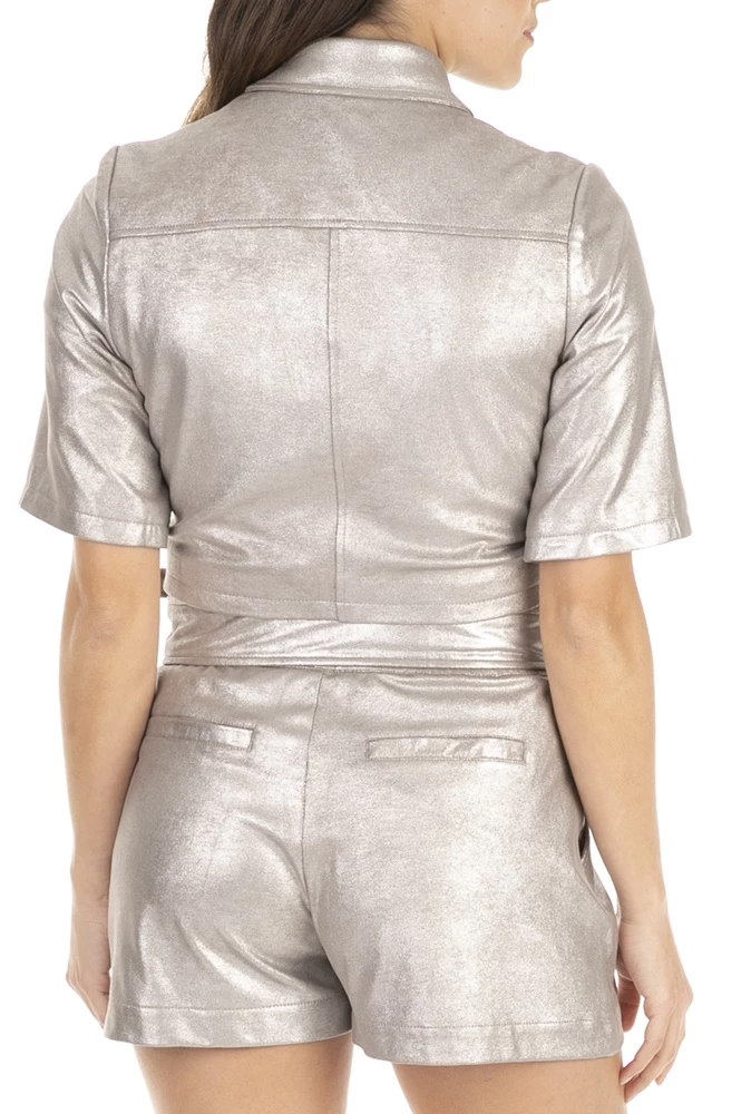 Γυναικείο cropped τζάκετ KOCCA σε ασημί απόχρωση. Έχει κοντά μανίκια, τσέπες και κλείνει με φερμουάρ.