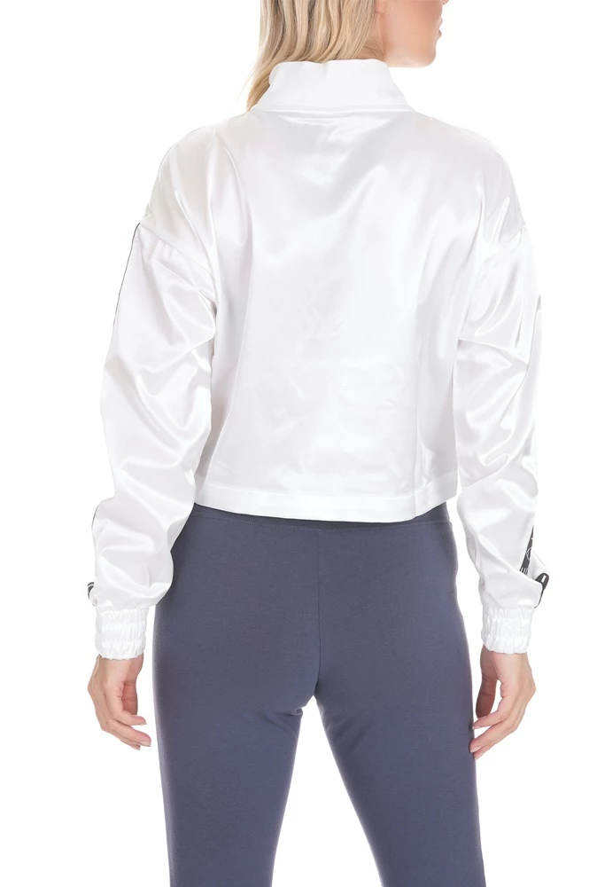 Γυναικείο cropped τζάκετ σε μοβ απόχρωση, από σατέν ύφασμα, με το λογότυπο στα μανίκια και κλείσιμο με φερμουάρ. Θα γίνει η αγαπημένη σου επιλογή για ένα εντυπωσιακό look!
