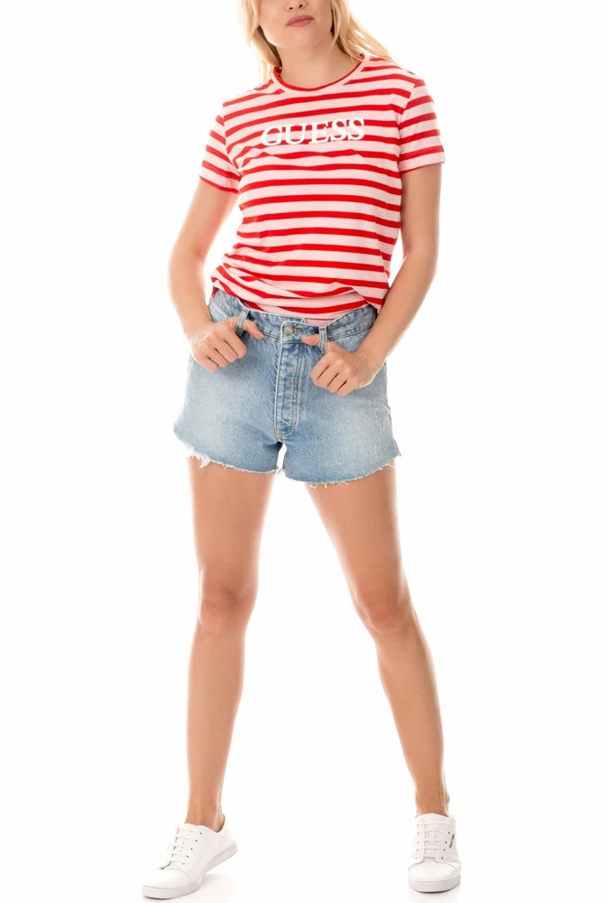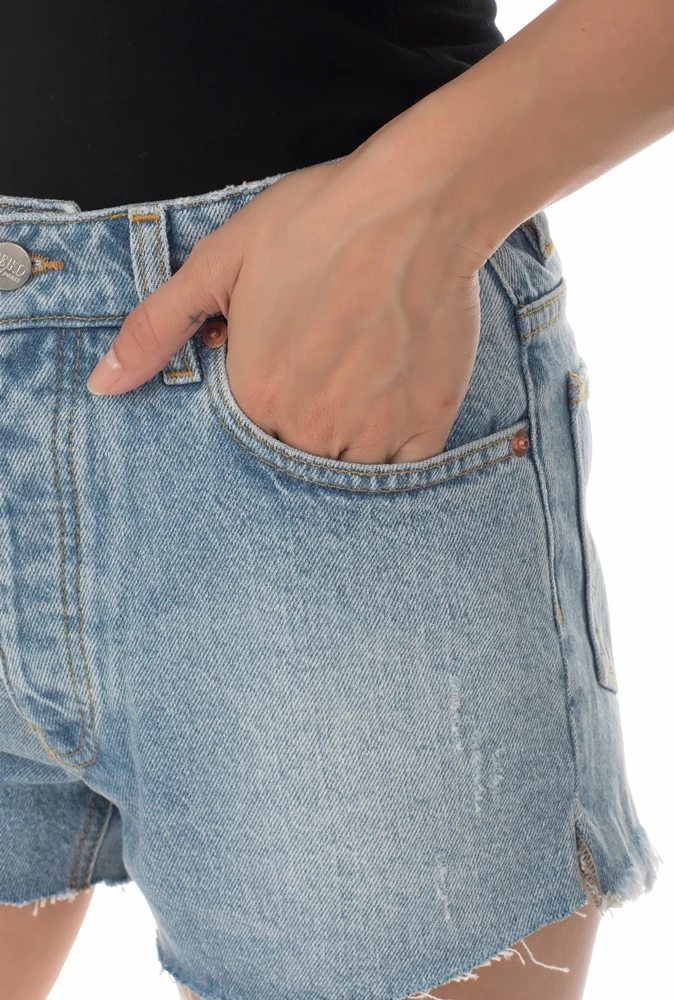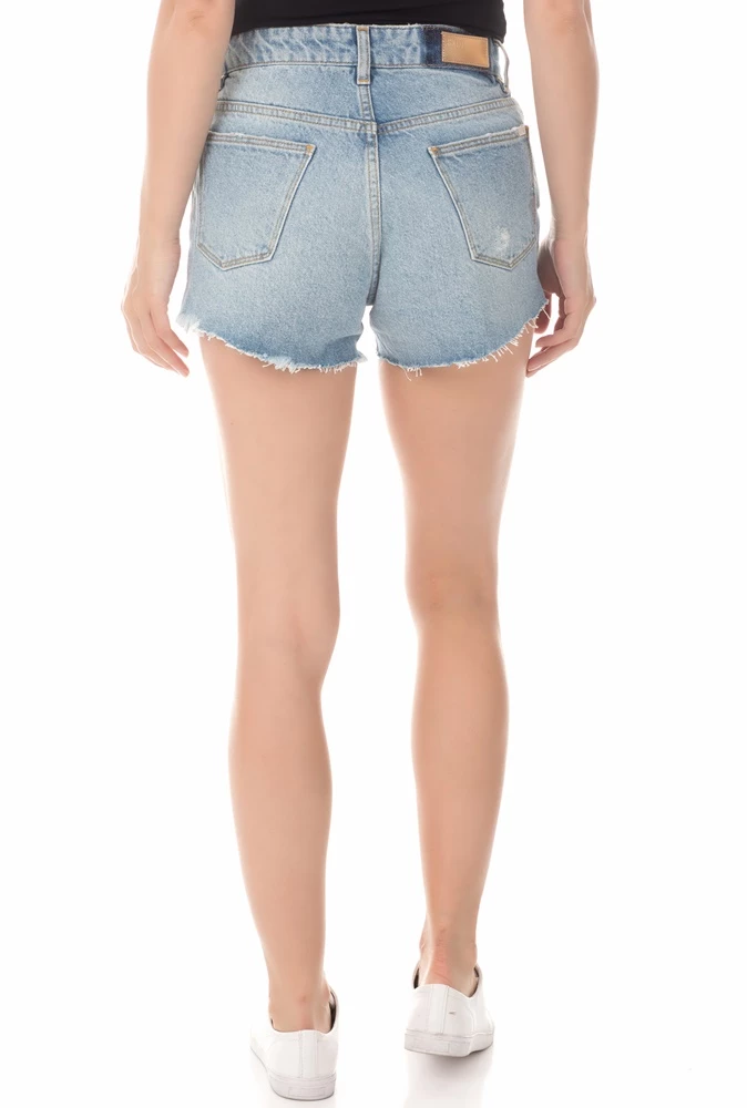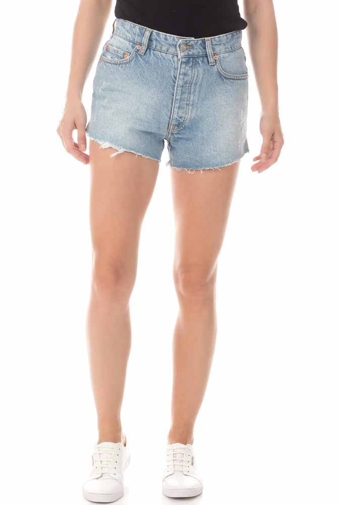 Βαμβακερό τζιν σορτς σε μπλε ανοιχτή απόχρωση, με τσέπες και ξέφτια στο τελείωμα.