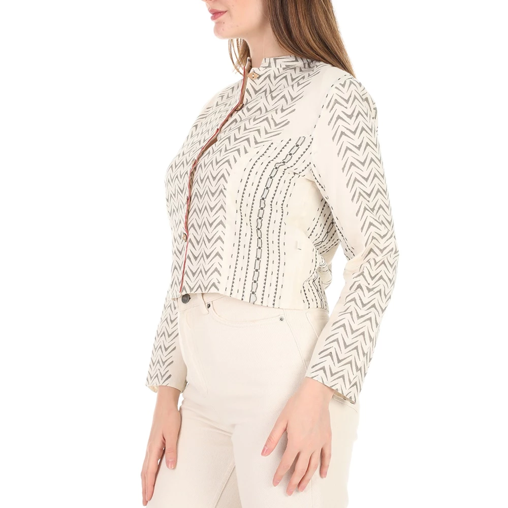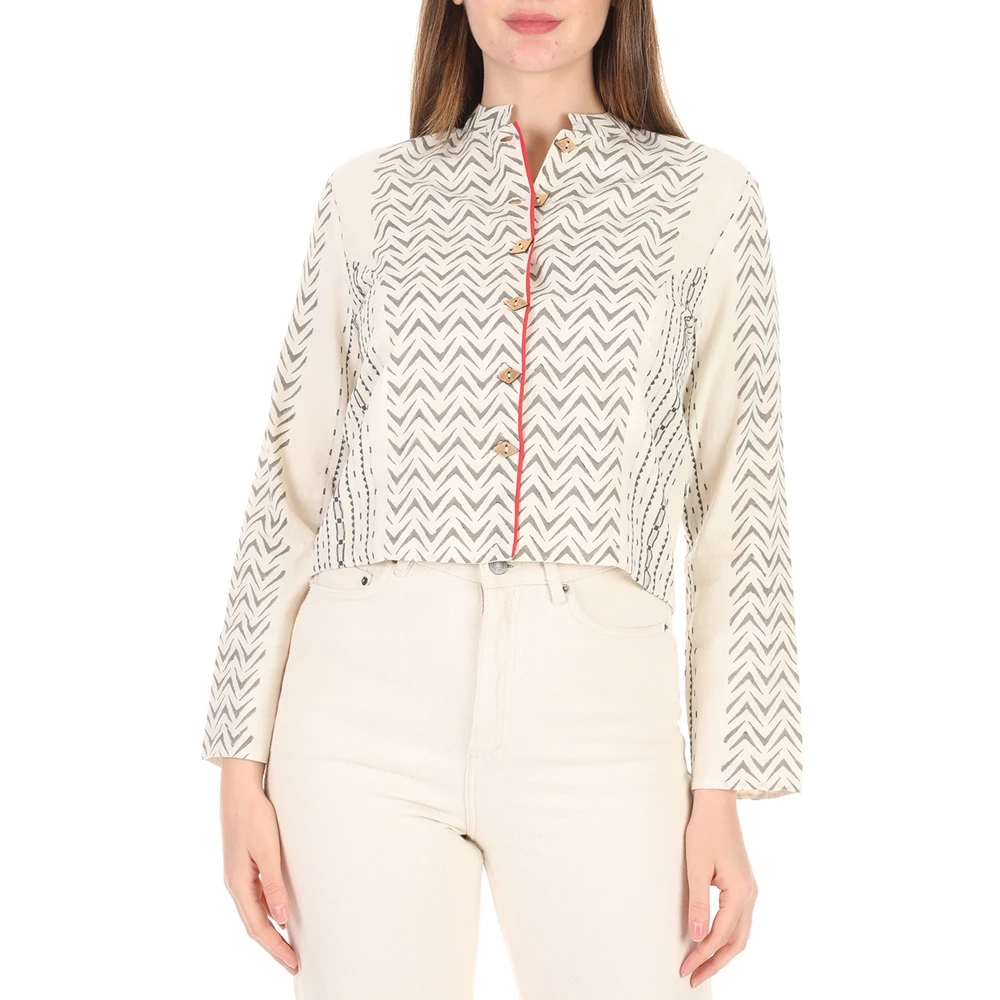 Γυναικείο jacket nisω λευκό με γκρι γεωμετρικά μοτίβα και κόκκινες λεπτομέρειες. Σε ίσια γραμμή, με κοντό μήκος. Έχει μακριά μανίκια και όρθιο γιακά. Κλείνει με ξύλινα κουμπιά μπροστά.